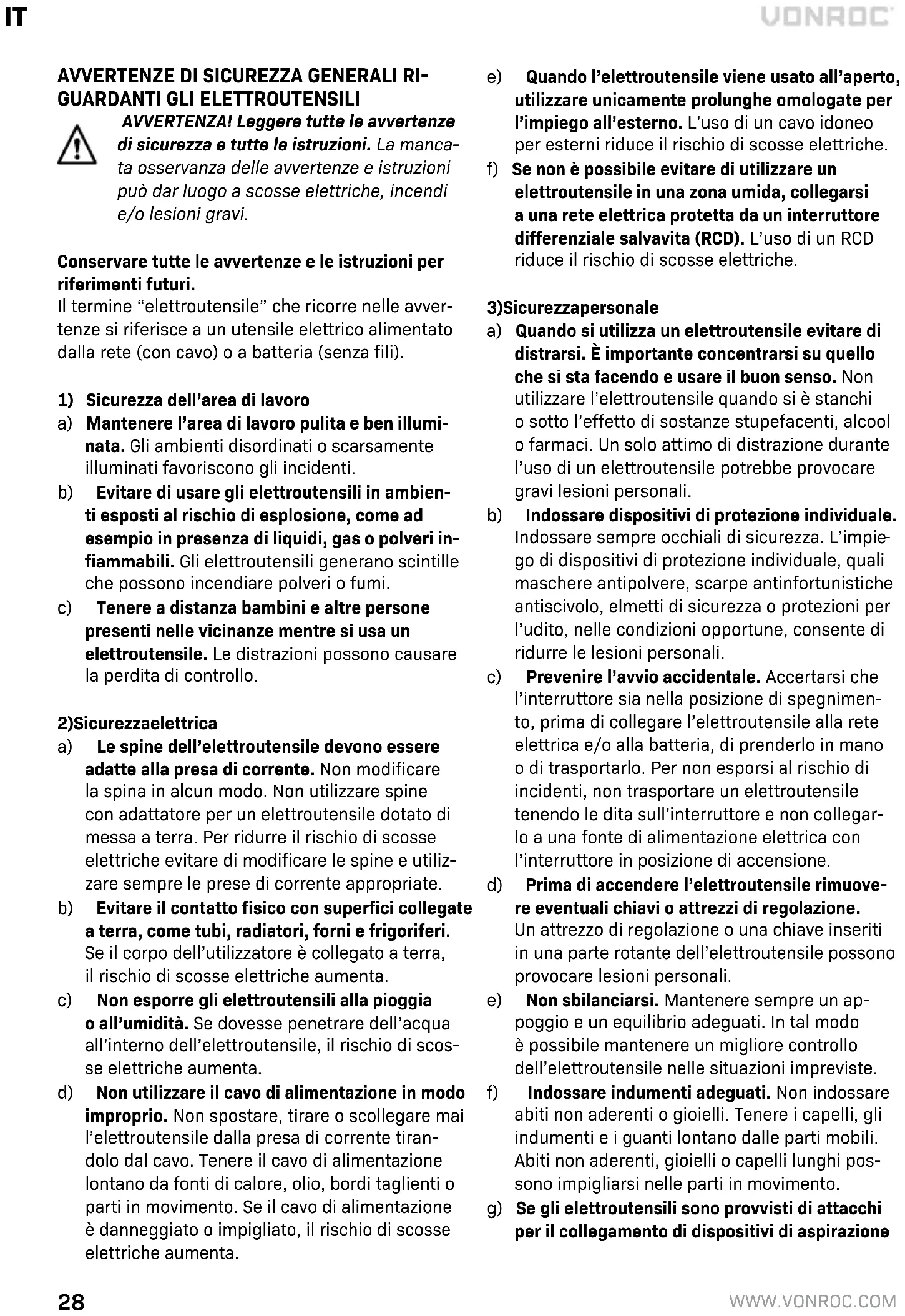 normative locali, gli elettroutensili ormai inutilizza- bili devono essere raccolti separatamente e smaltiti nel rispetto dell’ambiente. GARANZIA I prodotti VONROC sono sviluppati secondo gli stan- dard di qualità più elevati e sono garantiti esenti da difetti, sia per quanto riguarda i materiali che la lavorazione, per il periodo stabilito per legge ade- correre dalla data di acquisto iniziale. Se durante questo periodo il prodotto dovesse presentare dei difetti di materiali e/o di lavorazione, contattare direttamente VONROC. Le seguenti circostanze sono escluse dalla garanzia: