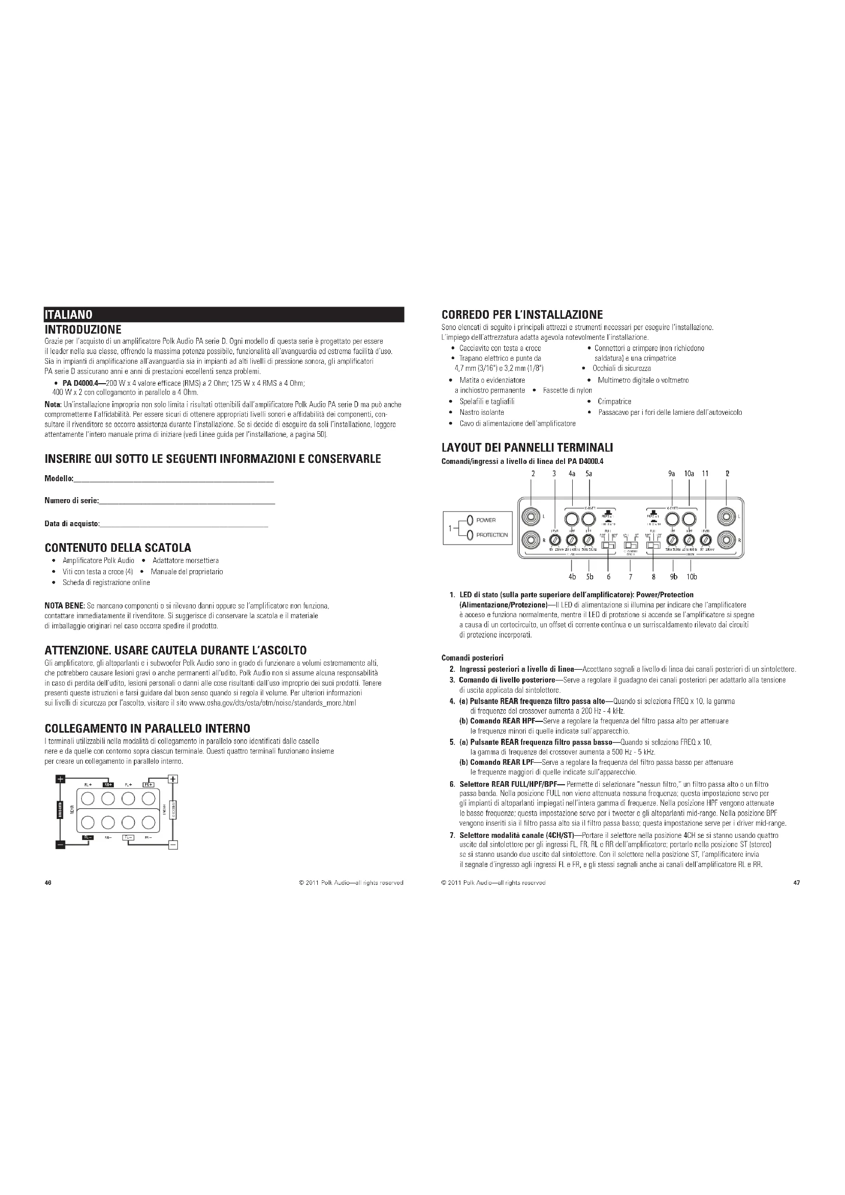 - PA D4000.4—200 W x 4 valore efficace (RMS) a 2 Ohm; 125 W x 4 RMS a 4 Ohm; 400 W x 2 con collegamento in parallelo a 4 Ohm. Nota: Un’installazione impropria non solo limita i risultati ottenibili dall’amplificatore Polk Audio PA serie D ma può anche comprometterne l’affidabilità. Per essere sicuri di ottenere appropriati livelli sonori e affidabilità dei componenti, con- sultare il rivenditore se occorre assistenza durante l’installazione. Se si decide di eseguire da soli l’installazione, leggere attentamente l’intero manuale prima di iniziare (vedi Linee guida per l’installazione, a pagina 50). INSERIRE QUI SOTTO LE SEGUENTI INFORMAZIONI E CONSERVARLE Modello:__________________________________________________ Numero di serie:____________________________________________ Data di acquisto:__________________________________________