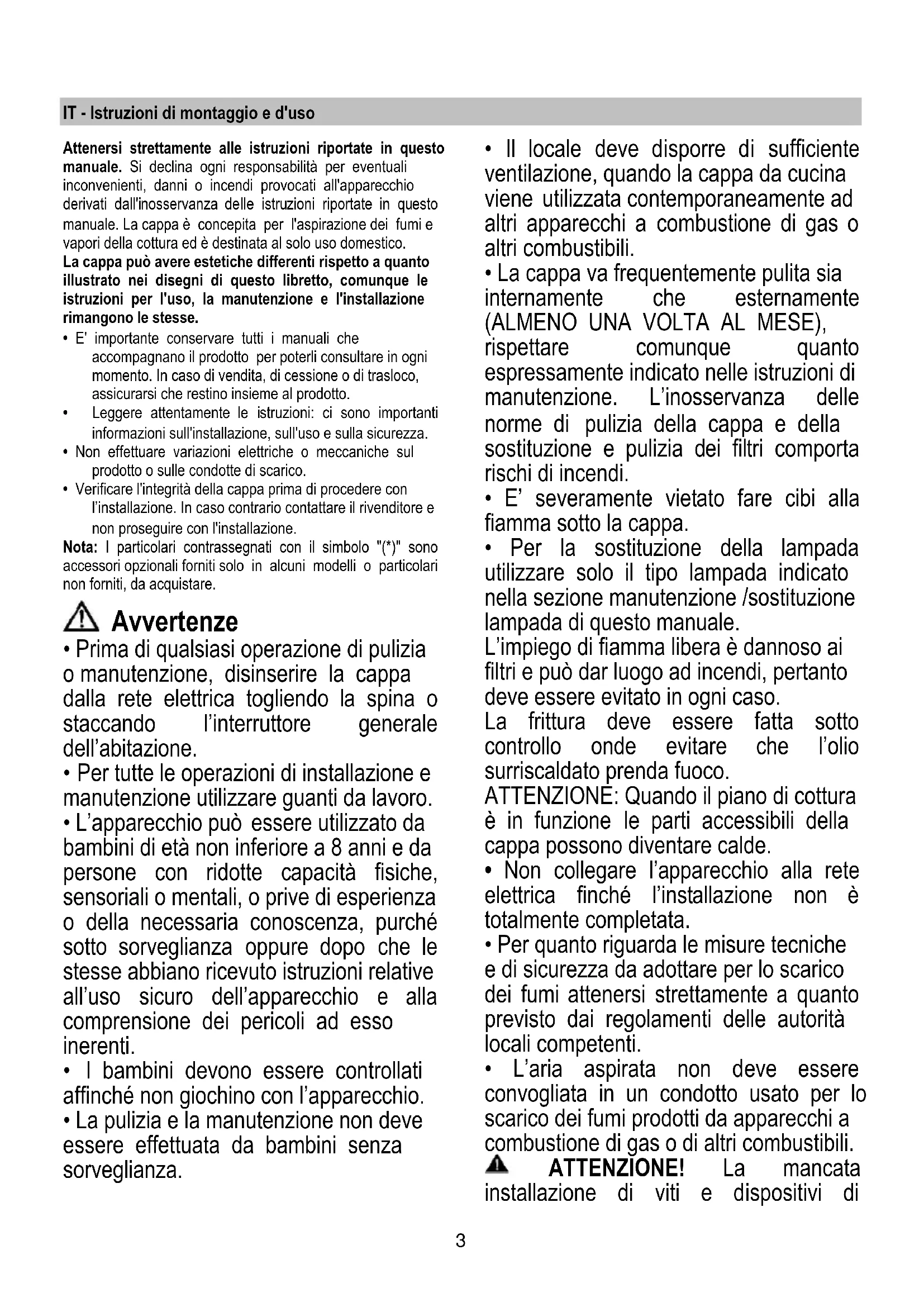IT - Istruzioni di montaggio e d'uso Attenersi strettamente alle istruzioni riportate in questo manuale. Si declina ogni responsabilità per eventuali inconvenienti, danni o incendi provocati all'apparecchio derivati dall'inosservanza delle istruzioni riportate in questo manuale. La cappa è concepita per l'aspirazione dei fumi e vapori della cottura ed è destinata al solo uso domestico. La cappa può avere estetiche differenti rispetto a quanto illustrato nei disegni di questo libretto, comunque le istruzioni per l'uso, la manutenzione e l'installazione rimangono le stesse.