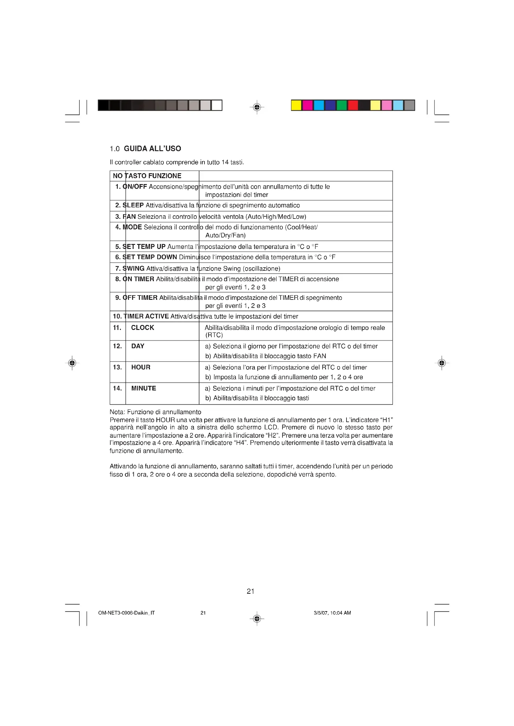 Il controller cablato comprende in tutto 14 tasti. Nota: Funzione di annullamento Premere il tasto HOUR una volta per attivare la funzione di annullamento per 1 ora. L’indicatore “H1” apparirà nell’angolo in alto a sinistra dello schermo LCD. Premere di nuovo lo stesso tasto per aumentare l’impostazione a 2 ore. Apparirà l’indicatore “H2”. Premere una terza volta per aumentare l’impostazione a 4 ore. Apparirà l’indicatore “H4”. Premendo ulteriormente il tasto verrà disattivata la funzione di annullamento. Attivando la funzione di annullamento, saranno saltati tutti i timer, accendendo l’unità per un periodo fisso di 1 ora, 2 ore o 4 ore a seconda della selezione, dopodiché verrà spento. OM-NET3-0906-Daikin_IT 3/5/07, 10:04 AM2122
