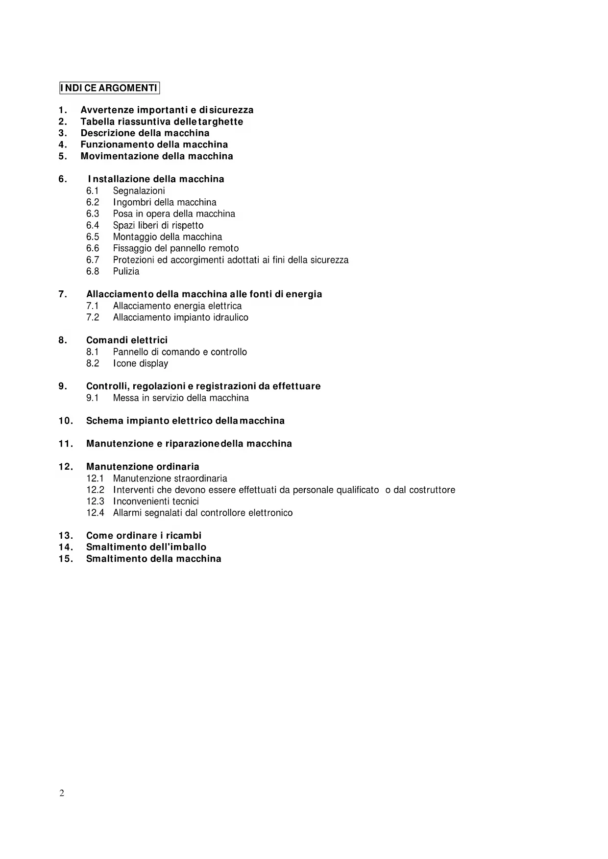Come ordinare i ricambi Dovendo ordinare delle parti di ricambio, fare riferimento al n° della matricola, riportato sulla targa della macchina. AVVERTENZA La sostituzione di parti usurate è consentita solo da personale istruito o dal costruttore.