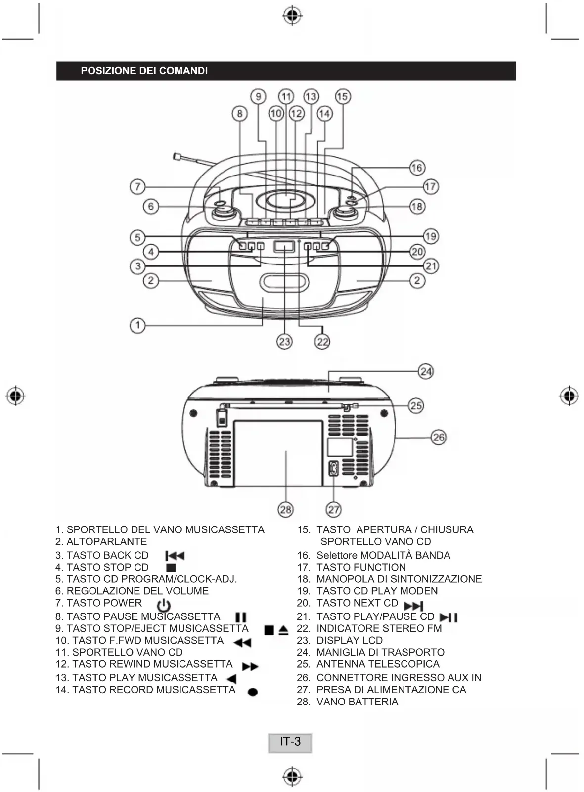 IT-3Premere il tasto POWER per accendere l’apparecchio. Per selezionare la modalità audio tra RADIO, AUX, TAPE e CD premere il tasto FUNCTION quando l’apparecchio è acceso. Sul display viene visualizzata la modalità audio attiva. Spegnere l’unità premendo il tasto POWER . La dicitura “OFF” viene visualizzata sul display, seguita dell’ora corrente. ACCENSIONE / SPEGNIMENT O DEL SISTEMA ALIMENTAZIONE UTILIZZO DELLA CORRENTE DOMESTICA Prima dell’uso, controllare che la tensione nominale dell’apparecchio corrisponda alla tensione locale. Attenzione: La spina di alimentazione viene utilizzata per scollegare il dispositivo dall’alimentazione elettrica. Il dispositivo di scollegamento deve rimanere facilmente accessibile.