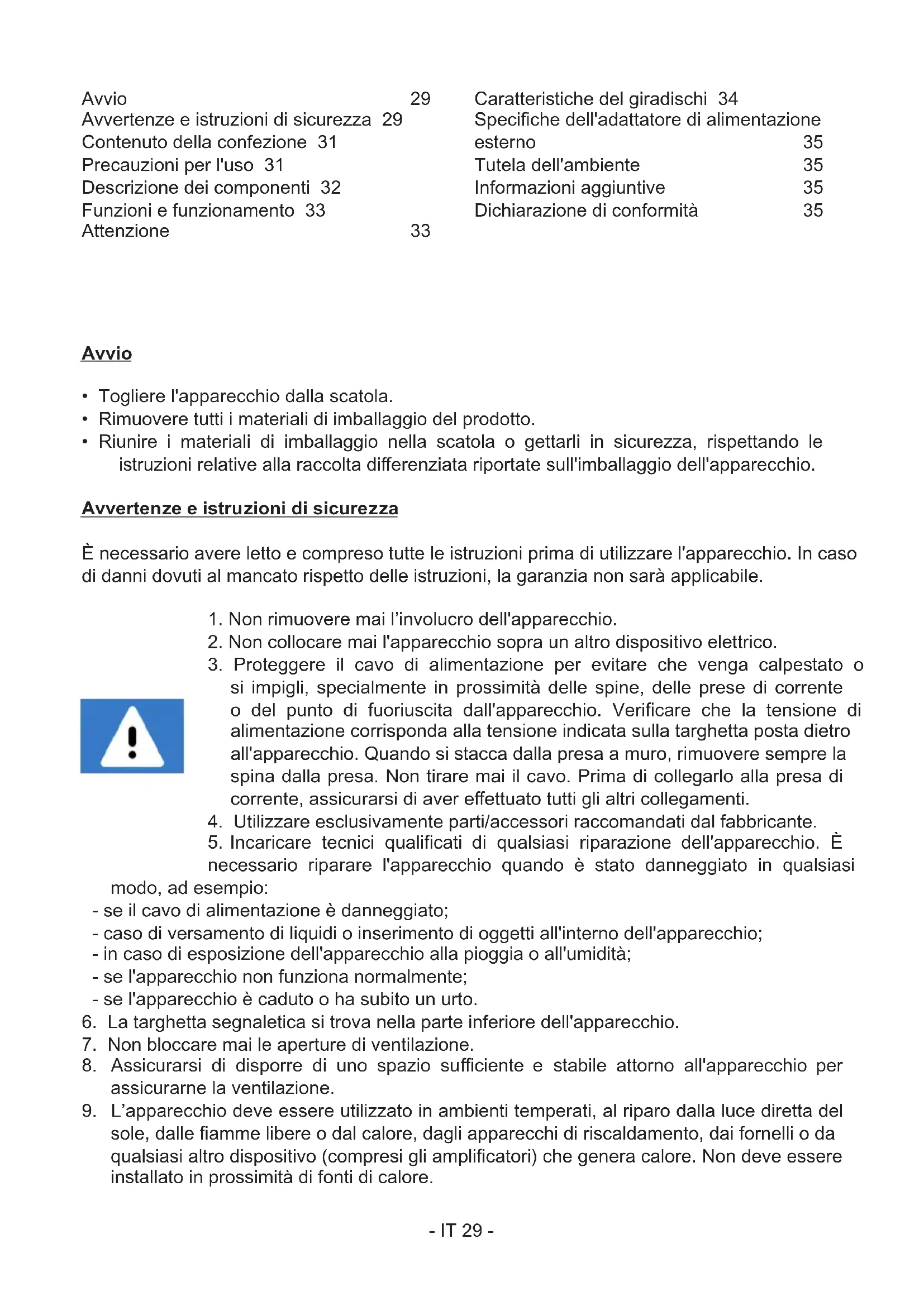 sole, dalle amme libere o dal calore, dagli apparecchi di riscaldamento, dai fornelli o da qualsiasi altro dispositivo (compresi gli amplicatori) che genera calore. Non deve essere inallato in prossimità di fonti di calore. Avvio 29 Avvertenze e iruzioni di sicurezza 29 Contenuto della confezione 31 Precauzioni per l'uso 31 Descrizione dei componenti 32 Funzioni e funzionamento 33 Attenzione 33 Caratteriiche del giradischi 34 Speciche dell'adattatore di alimentazione eerno 35 Tutela dell'ambiente 35 Informazioni aggiuntive 35 Dichiarazione di conformità 35- IT 30 -