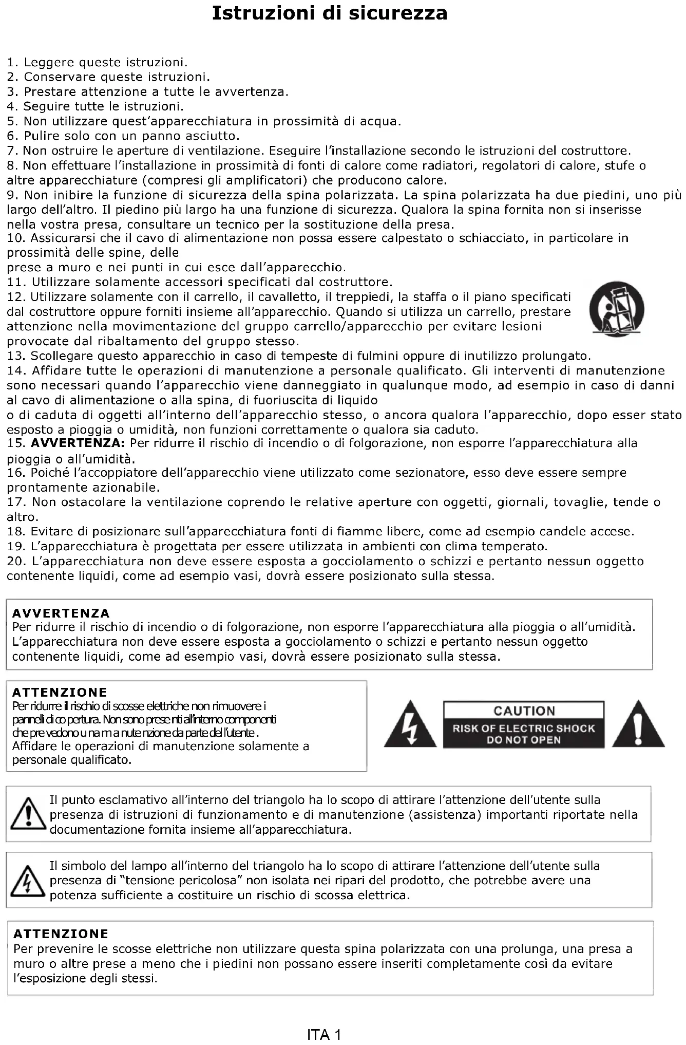 Il punto esclamativo all’interno del triangolo ha lo scopo di attirare l’attenzione dell’utente sulla presenza di istruzioni di funzionamento e di manutenzione (assistenza) importanti riportate nella documentazione fornita insieme all’apparecchiatura. Il simbolo del lampo all’interno del triangolo ha lo scopo di attirare l’attenzione dell’utente sulla presenza di “tensione pericolosa” non isolata nei ripari del prodotto, che potrebbe avere una potenza sufficiente a costituire un rischio di scossa elettrica. AVVERTENZA Per ridurre il rischio di incendio o di folgorazione, non esporre l’apparecchiatura alla pioggia o all’umidità. L’apparecchiatura non deve essere esposta a gocciolamento o schizzi e pertanto nessun oggetto contenente liquidi, come ad esempio vasi, dovrà essere posizionato sulla stessa. ATTENZIONE Per prevenire le scosse elettriche non utilizzare questa spina polarizzata con una prolunga, una presa a muro o altre prese a meno che i piedini non possano essere inseriti completamente così da evitare l’esposizione degli stessi. ATTENZIONE Per ridurre il rischio di scosse elettriche non rimuovere i pannelli di co pertura. Non sono prese nti all’interno componenti che pre vedono u na m a nute nzione da parte del l’utente . Affidare le operazioni di manutenzione solamente a personale qualificato.ITA 2 A. Accessori e installazione dei driver