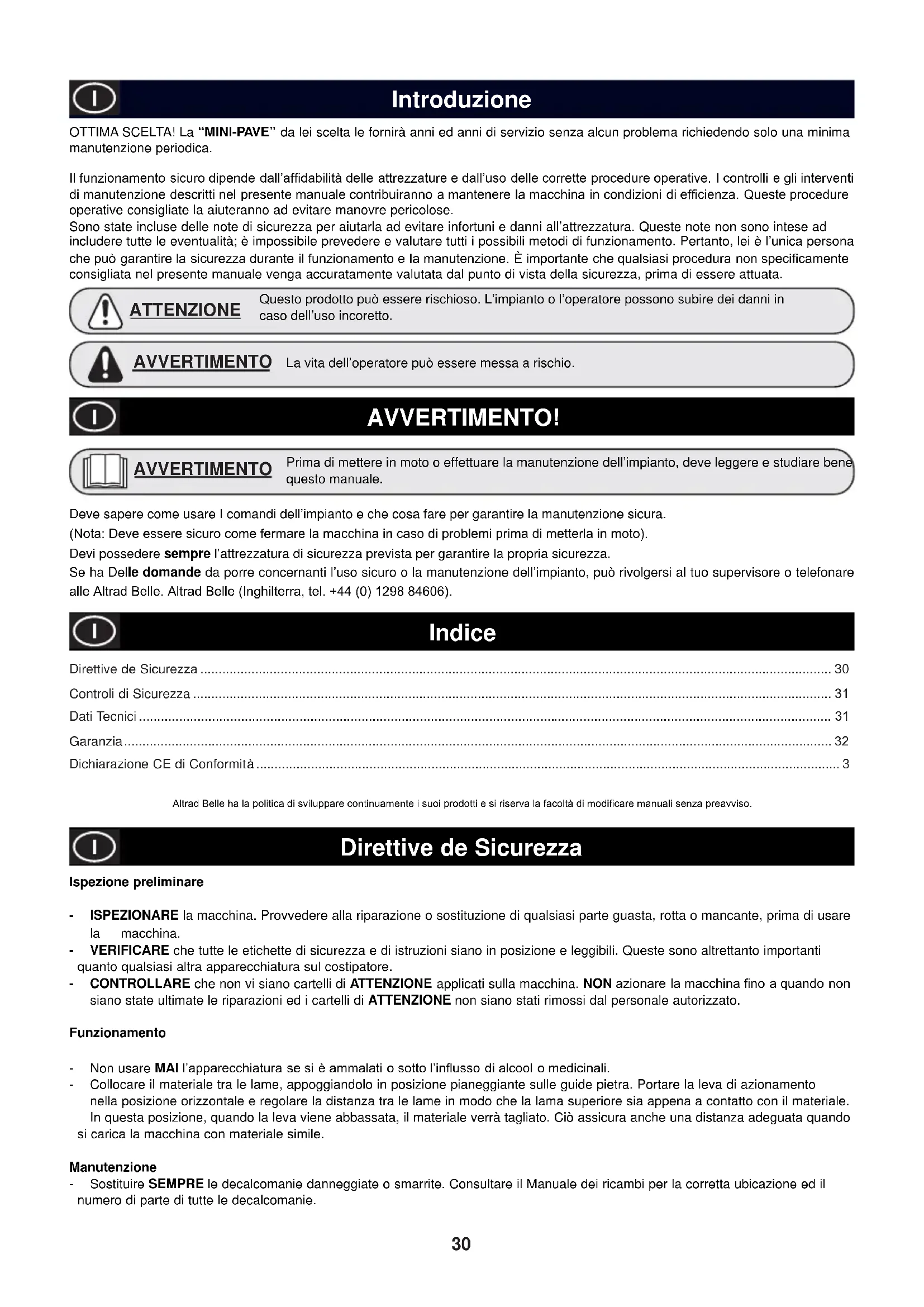 operative consigliate la aiuteranno ad evitare manovre pericolose. Sono state incluse delle note di sicurezza per aiutarla ad evitare infortuni e danni all’attrezzatura. Queste note non sono intese ad includere tutte le eventualità; è impossibile prevedere e valutare tutti i possibili metodi di funzionamento. Pertanto, lei è l’unica persona FKHSXzJDUDQWLUHODVLFXUH]]DGXUDQWHLOIXQ]LRQDPHQWRHODPDQXWHQ]LRQHÊLPSRUWDQWHFKHTXDOVLDVLSURFHGXUDQRQVSHFL¿FDPHQWH consigliata nel presente manuale venga accuratamente valutata dal punto di vista della sicurezza, prima di essere attuata. Direttive de Sicurezza ............................................................................................................................................................................. 30 Controli di Sicurezza ............................................................................................................................................................................... Dati Tecnici .............................................................................................................................................................................................. Garanzia .................................................................................................................................................................................................. Dichiarazione CE di Conformit à ................................................................................................................................................................ 3 $OWUDG%HOOHKDODSROLWLFDGLVYLOXSSDUHFRQWLQXDPHQWHLVXRLSURGRWWLHVLULVHUYDODIDFROWjGLPRGL¿FDUHPDQXDOLVHQ]DSUHDYYLVR Direttive de Sicurezza Ispezione preliminare - ISPEZIONARE la macchina. Provvedere alla riparazione o sostituzione di qualsiasi parte guasta, rotta o mancante, prima di usare la macchina. - VERIFICARE che tutte le etichette di sicurezza e di istruzioni siano in posizione e leggibili. Queste sono altrettanto importanti quanto qualsiasi altra apparecchiatura sul costipatore. - CONTROLLARE che non vi siano cartelli di ATTENZIONE applicati sulla macchina. NON D]LRQDUHODPDFFKLQD¿QRDTXDQGRQRQ siano state ultimate le riparazioni ed i cartelli di ATTENZIONE non siano stati rimossi dal personale autorizzato. Funzionamento - Non usare MAI O¶DSSDUHFFKLDWXUDVHVLqDPPDODWLRVRWWRO¶LQÀXVVRGLDOFRRORPHGLFLQDOL - Collocare il materiale tra le lame, appoggiandolo in posizione pianeggiante sulle guide pietra. Portare la leva di azionamento nella posizione orizzontale e regolare la distanza tra le lame in modo che la lama superiore sia appena a contatto con il materiale. In questa posizione, quando la leva viene abbassata, il materiale verrà tagliato. Ciò assicura anche una distanza adeguata quando si carica la macchina con materiale simile. Manutenzione - Sostituire SEMPRE le decalcomanie danneggiate o smarrite. Consultare il Manuale dei ricambi per la corretta ubicazione ed il numero di parte di tutte le decalcomanie. La vita dell’operatore può essere messa a rischio. AVVERTIMENTO AVVERTIMENTO! Deve sapere come usare I comandi dell’impianto e che cosa fare per garantire la manutenzione sicura. 1RWD'HYHHVVHUHVLFXURFRPHIHUPDUHODPDFFKLQDLQFDVRGLSUREOHPLSULPDGLPHWWHUODLQPRWR Devi possedere sempre l’attrezzatura di sicurezza prevista per garantire la propria sicurezza. Se ha Delle domande da porre concernanti l’uso sicuro o la manutenzione dell’impianto, può rivolgersi al tuo supervisore o telefonare