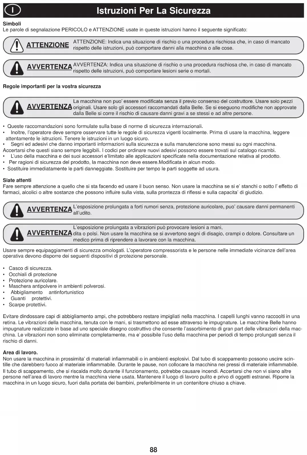 - Scarpe protettivi. Evitare dindossare capi di abbigliamento ampi, che potrebbero restare impigliati nella macchina. I capelli lunghi vanno raccoolti in una retina. Le vibrazioni della macchina, tenuta con le mani, si trasmettono ad esse attraverso le impugnature. Le macchine Belle hanno impugnature realizzate in base ad uno speciale disegno costruttivo che consente l’assorbimento di gran part delle vibrazioni della mac- china. Le vibrazioni non sono eliminate completamente, ma e’ possibile l’uso della macchina per periodi di tempo prolungati senza il rischio di danni. Area di lavoro.
