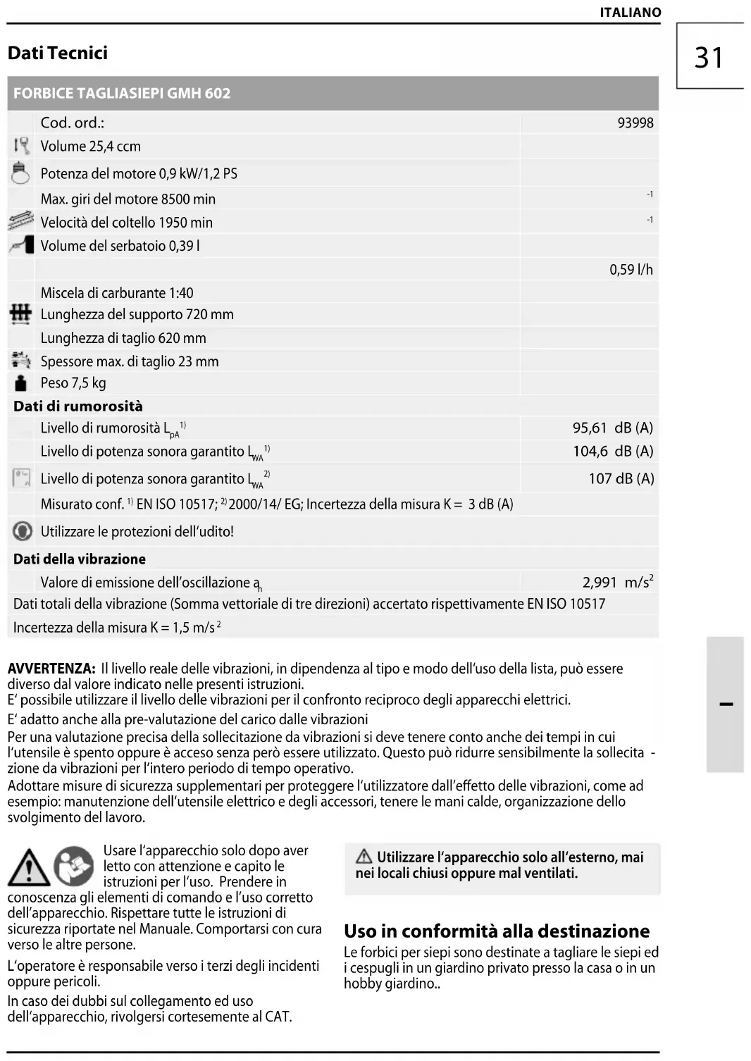 2000/14/ EG; Incertezza della misura K = 3 dB (A) Utilizzare le protezioni dell‘udito! Dati della vibrazione Valore di emissione dell’oscillazione a