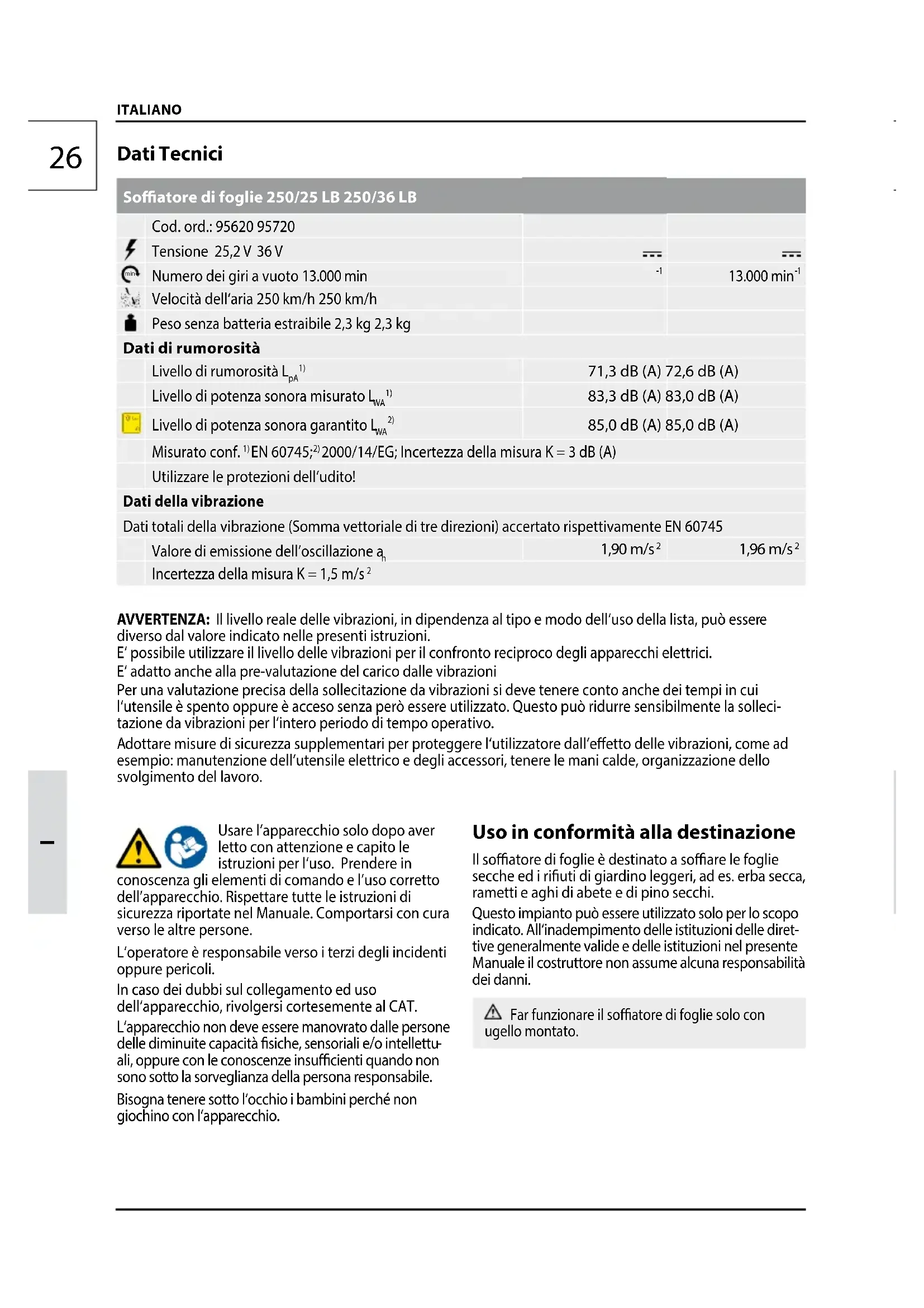 anuale il costruttore non assume alcuna responsabilità dei danni. Far funzionare il soatore di foglie solo con ugello montato. Dati Tecnici Soatore di foglie 250/25 LB 250/36 LB Cod. ord.: 95620 95720 Tensione 25,2 V 36 V min Numero dei giri a vuoto 13.000 min
