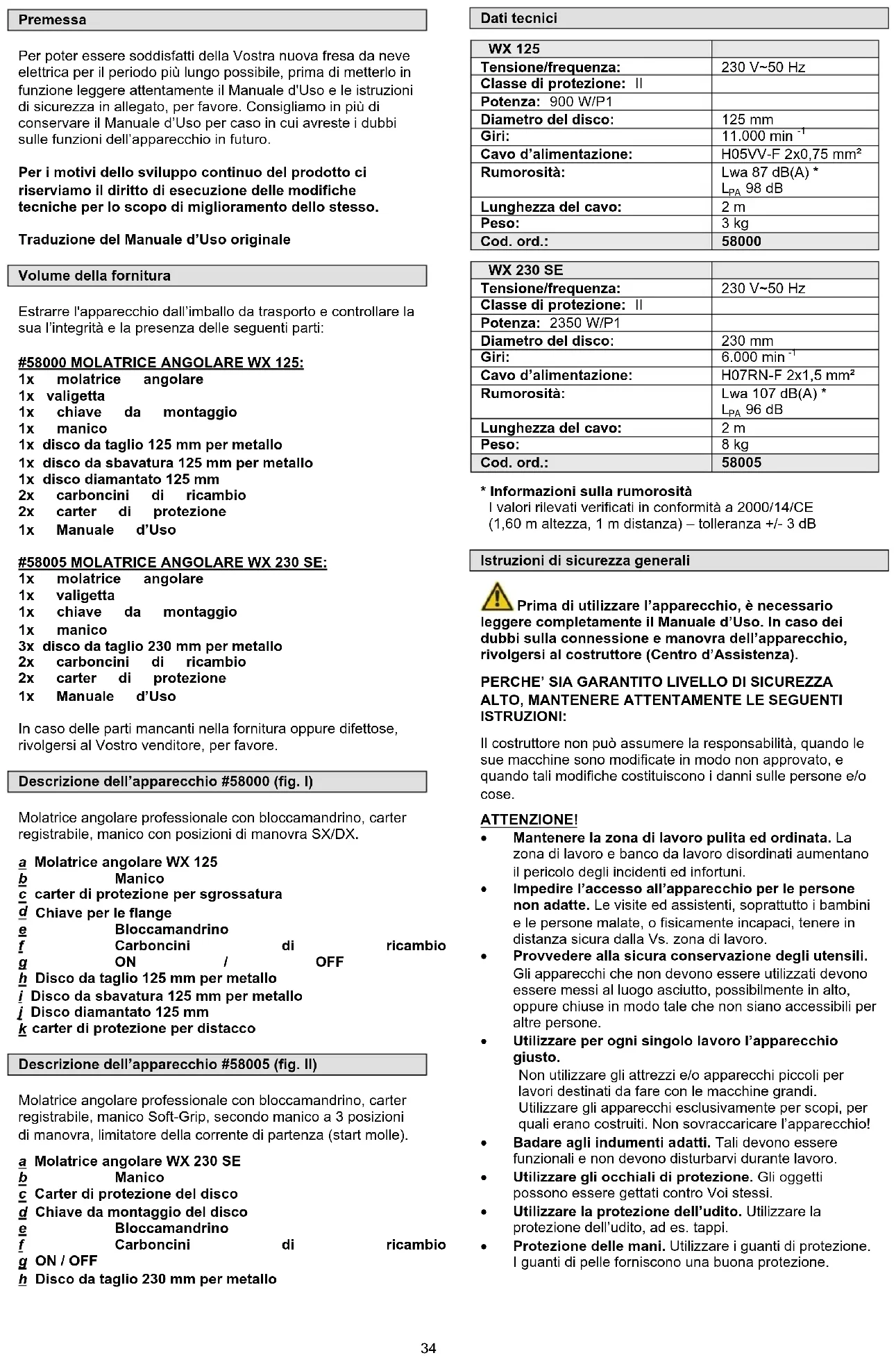 carter di protezione per distacco Descrizione dell’apparecchio #58005 (fig. II) Molatrice angolare professionale con bloccamandrino, carter registrabile, manico Soft-Grip, secondo manico a 3 posizioni di manovra, limitatore della corrente di partenza (start molle). a Molatrice angolare WX 230 SE b Manico c Carter di protezione del disco d Chiave da montaggio del disco e Bloccamandrino f Carboncini di ricambio g ON / OFF h Disco da taglio 230 mm per metallo Dati tecnici WX 125 Tensione/frequenza: 230 V~50 Hz Classe di protezione: II Potenza: 900 W/P1 Diametro del disco: 125 mm Giri: 11.000 min