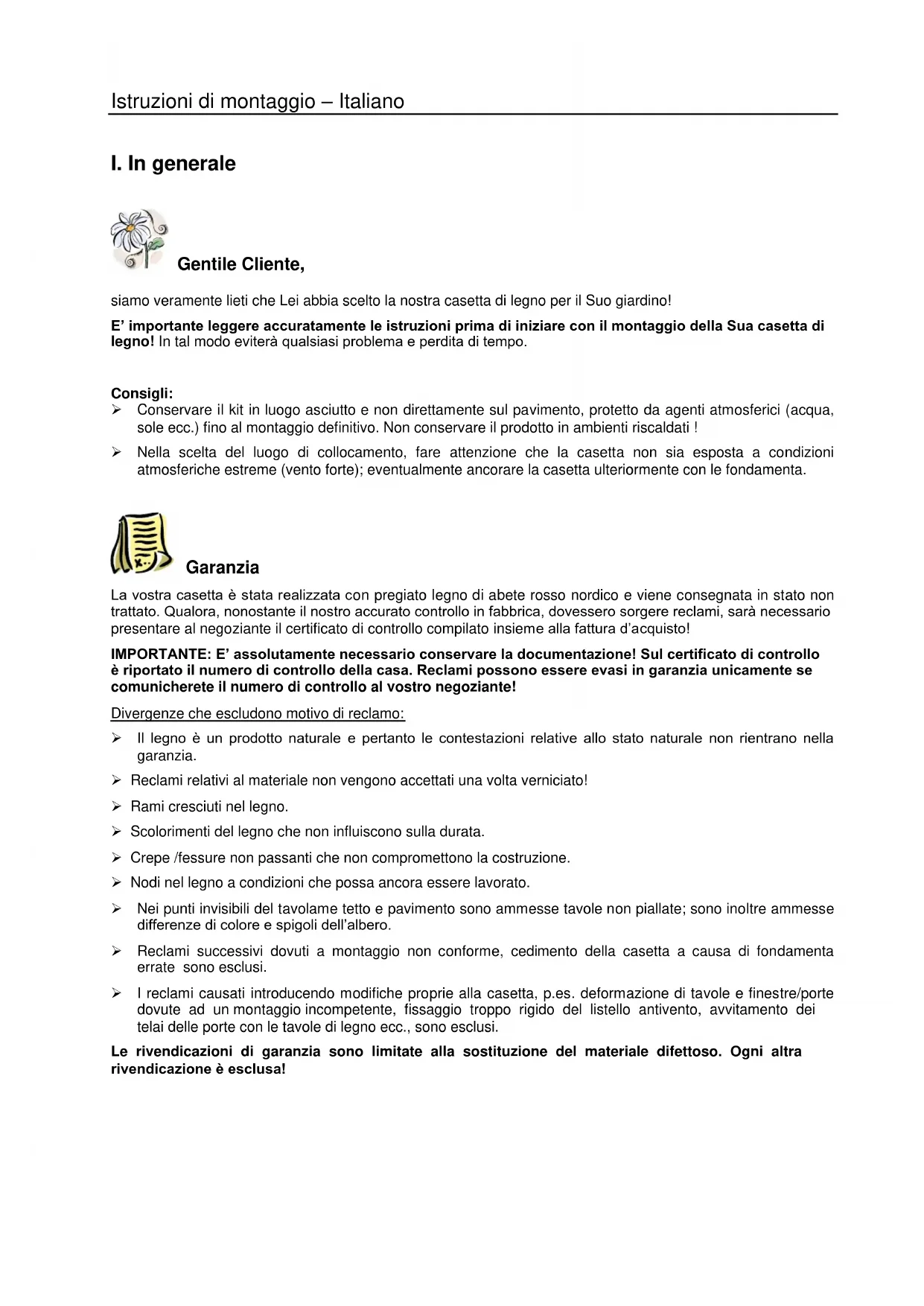 Gentile Cliente, siamo veramente lieti che Lei abbia scelto la nostra casetta di legno per il Suo giardino! E’ importante leggere accuratamente le istruzioni prima di iniziare con il montaggio della Sua casetta di legno! In tal modo eviterà qualsiasi problema e perdita di tempo. Consigli: Conservare il kit in luogo asciutto e non direttamente sul pavimento, protetto da agenti atmosferici (acqua, sole ecc.) fino al montaggio definitivo. Non conservare il prodotto in ambienti riscaldati ! Nella scelta del luogo di collocamento, fare attenzione che la casetta non sia esposta a condizioni atmosferiche estreme (vento forte); eventualmente ancorare la casetta ulteriormente con le fondamenta. Garanzia La vostra casetta è stata realizzata con pregiato legno di abete rosso nordico e viene consegnata in stato non trattato. Qualora, nonostante il nostro accurato controllo in fabbrica, dovessero sorgere reclami, sarà necessario presentare al negoziante il certificato di controllo compilato insieme alla fattura d’acquisto! IMPORTANTE: E’ assolutamente necessario conservare la documentazione! Sul certificato di controllo è riportato il numero di controllo della casa. Reclami possono essere evasi in garanzia unicamente se comunicherete il numero di controllo al vostro negoziante! Divergenze che escludono motivo di reclamo: Il legno è un prodotto naturale e pertanto le contestazioni relative allo stato naturale non rientrano nella garanzia. Reclami relativi al materiale non vengono accettati una volta verniciato! Rami cresciuti nel legno. Scolorimenti del legno che non influiscono sulla durata. Crepe /fessure non passanti che non compromettono la costruzione. Nodi nel legno a condizioni che possa ancora essere lavorato. Nei punti invisibili del tavolame tetto e pavimento sono ammesse tavole non piallate; sono inoltre ammesse differenze di colore e spigoli dell’albero. Reclami successivi dovuti a montaggio non conforme, cedimento della casetta a causa di fondamenta errate sono esclusi. I reclami causati introducendo modifiche proprie alla casetta, p.es. deformazione di tavole e finestre/porte dovute ad un montaggio incompetente, fissaggio troppo rigido del listello antivento, avvitamento dei telai delle porte con le tavole di legno ecc., sono esclusi. Le rivendicazioni di garanzia sono limitate alla sostituzione del materiale difettoso. Ogni altra rivendicazione è esclusa!Istruzioni di montaggio – Italiano Verniciatura e cura Il legno è un prodotto naturale e si muova in modo diverso. Caratteristiche quali venature grosse e fini, sfumature di colore e cambiamenti nonché nodi sono dovuti alla crescita dell’albero. Sono del tutto normali nei legni che crescono all’aperto, e pertanto non sono da considerare difetti ma piuttosto una caratteristica del legno naturale. Il legno non trattato (ad eccezione dei travetti) diventa grigio col tempo, può scolorirsi e fare la muffa. Per proteggere la vostra casetta di legno, è consigliabile trattarla con opportuni preservanti per legno. Per proteggere al meglio la vostra casetta da giardino, consigliamo di trattare le tavole del pavimento preventivamente con un colore di fondo neutro, in particolare la parte inferiore che non sarà più raggiungibile dopo il montaggio. Solo in questo modo la penetrazione di umidità potrà essere evitata. Consigliamo di trattare in ogni caso anche porte e finestre con un colore di fondo. E’ molto importante verniciare sia il lato interno che quello esterno delle porte in un’unica soluzione, altrimenti potrebbero deformarsi ! Dopo il montaggio, consigliamo di applicare uno strato di fondo sulla pelle esterna (senza tetto), non appena il medesimo si sarà asciugato, verniciare la casetta con una velatura per legno per proteggere il legno dall’umidità e dalle radiazioni UV. Per la verniciatura, usare attrezzi e vernici di qualità e rispettare le istruzioni di sicurezza e applicazione del produttore della vernice. Non verniciare in pieno sole o in caso di pioggia. Farsi consigliare dettagliatamente dal venditore sulla protezione di legni di conifera non trattati. Con una regolare verniciatura aumenterete notevolmente la durata della vostra casetta da giardino. Consigliamo un’ispezione semestrale della casetta.