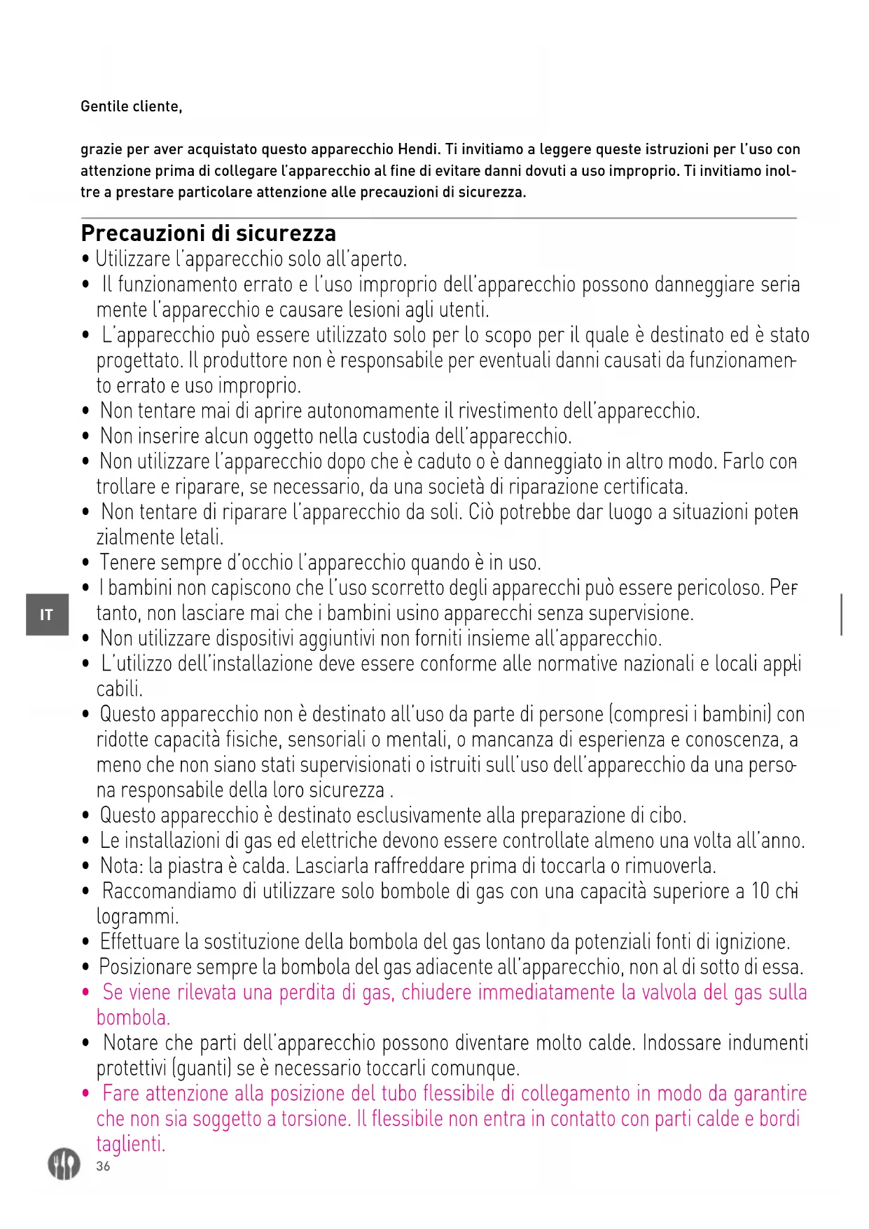 - Chiudere sempre la valvola del gas sulla bombola del gas se l’apparecchio non viene più utilizzato.