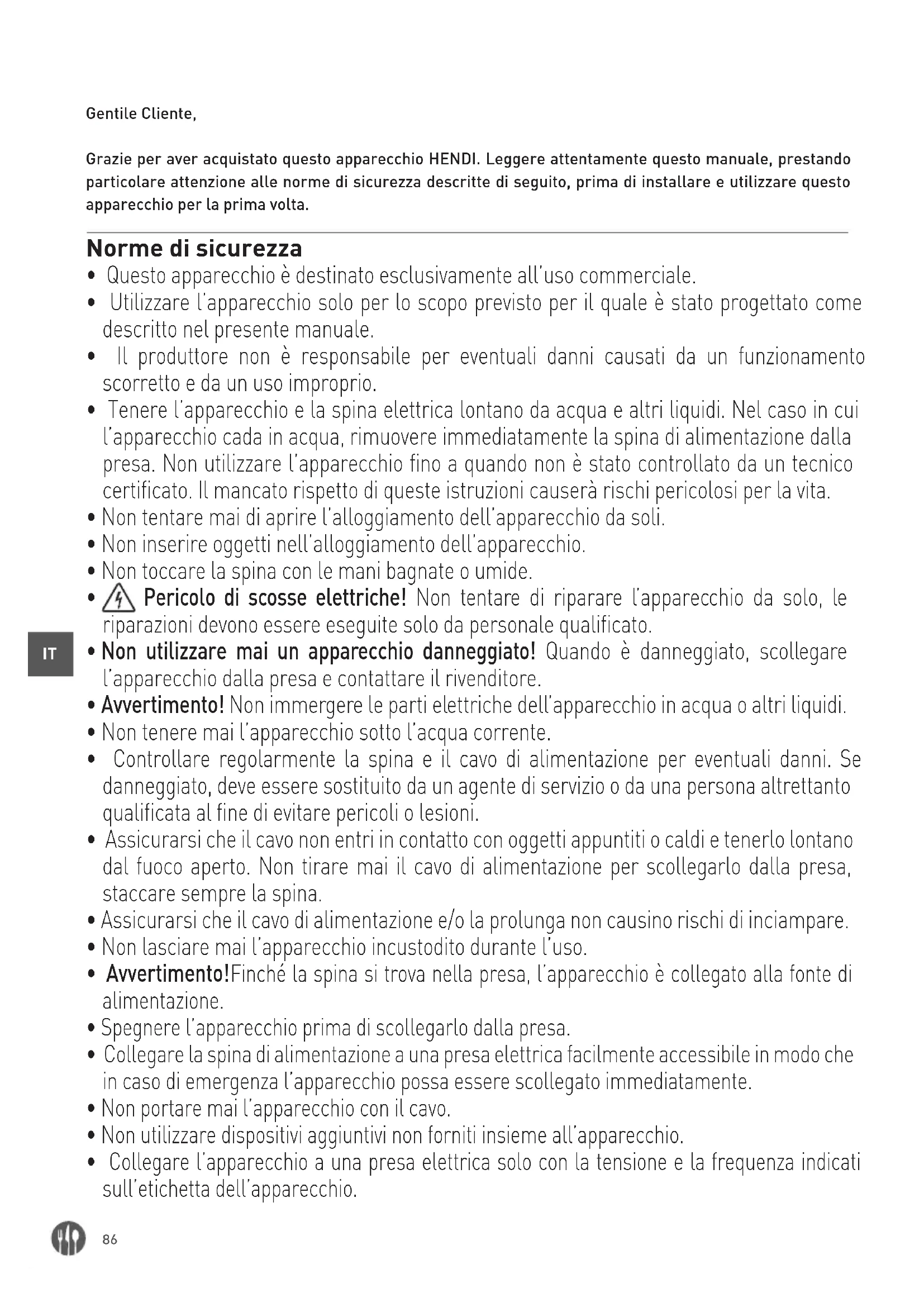 Gentile Cliente, Grazie per aver acquistato questo apparecchio HENDI. Leggere attentamente questo manuale, prestando particolare attenzione alle norme di sicurezza descritte di seguito, prima di installare e utilizzare questo apparecchio per la prima volta. Norme di sicurezza