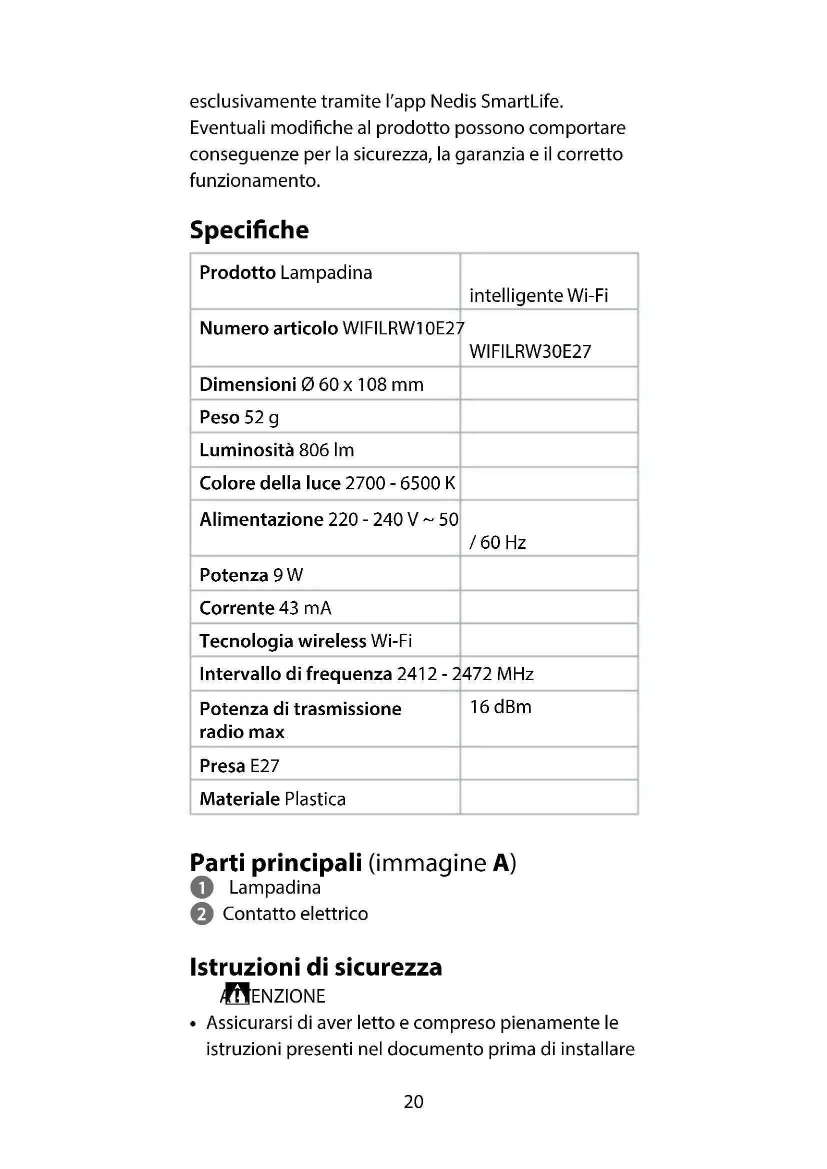 b. Selezionare la lampadina dall’elenco dei dispositivi disponibili.c. Selezionare AP Mode in alto a destra.d. Spegnere e accendere la lampadina per 3 volte e controllare che la luce inizi a lampeggiare lentamente.e. Seguire i passaggi nell’applicazione. Utilizzo del prodotto Il prodotto può essere controllato da qualsiasi distanza utilizzando l’app Nedis SmartLife.Il menu home dell’app Nedis SmartLife mostra una casella di controllo per ciascuna lampada e/o gruppo collegati. Il prodotto può essere collegato a Google Home o Amazon Alexa per consentire il controllo vocale. Il prodotto può essere collegato a IFTTT per consentire l’attivazione della lampadina da parte di condizioni esterne. Per scoprire tutte le possibilità del presente prodotto Nedis® consultare la nostra pagina web di supporto. Dichiarazione di conformità Noi sottoscritti, Nedis B.V., dichiariamo, in quanto fabbricanti, che il prodotto WIFILRW10E27 | WIFILRW30E27 con il nostro marchio Nedis®, prodotto24 Especicaciones Producto Bombilla inteligente Wi-Fi Número de artículo WIFILRW10E27 WIFILRW30E27 Dimensiones Ø 60 x 108 mm Peso 52 g Brillo 806 lm Color de la luz 2700 - 6500 K Suministro eléctrico 220 - 240 V ~ 50 / 60 Hz Vataje 9 W Corriente 43 mA Tecnología inalámbrica Wi-Fi Rango de frecuencia 2412 - 2472 MHz Potencia máx. de radiotransmisión 16 dBm Casquillo E27 Material Plástico Partes principales (imagen A) 1 Bombilla 2 Contacto eléctrico Instrucciones de seguridad