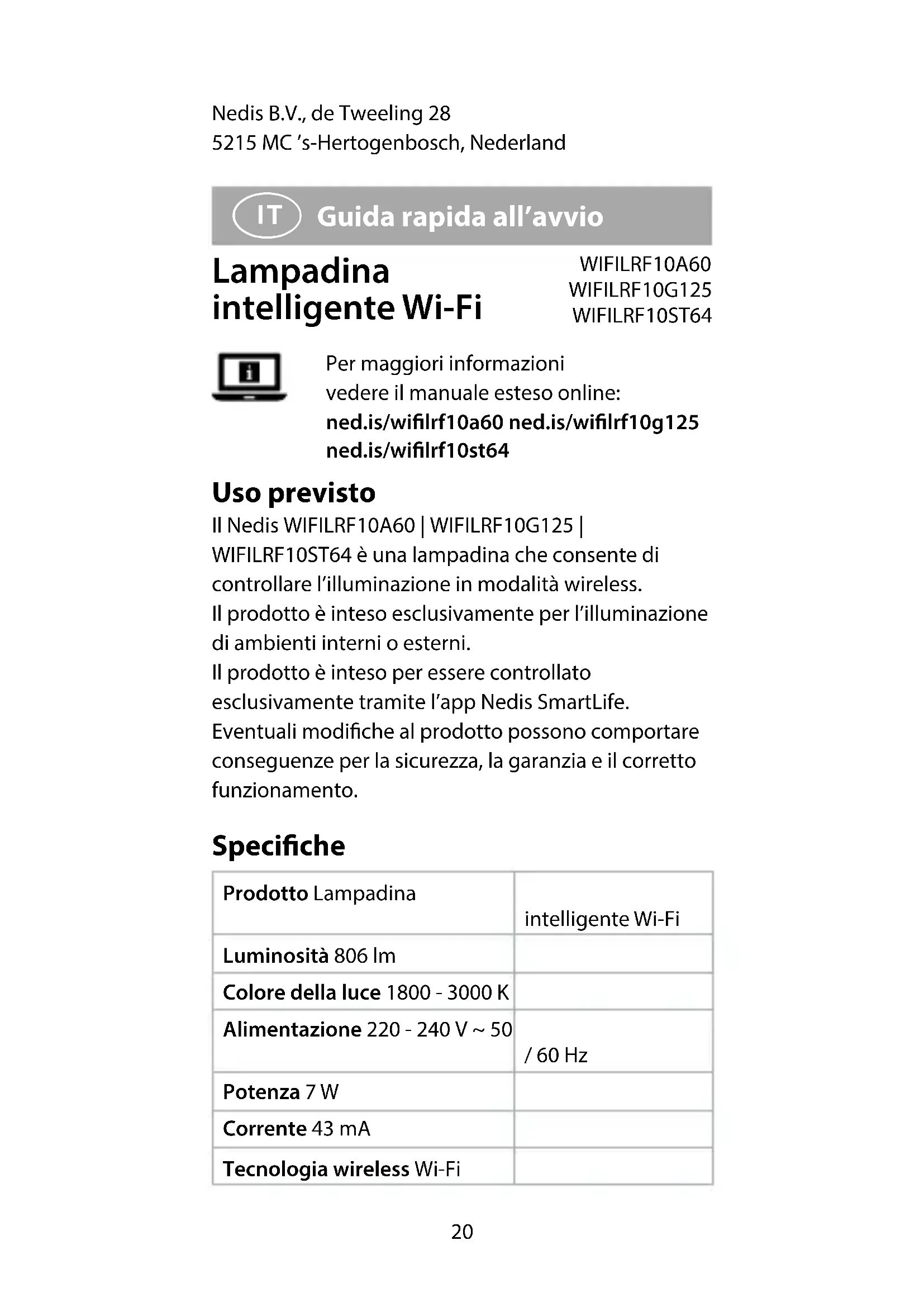 Guida rapida all’avvio Lampadina intelligente Wi-Fi WIFILRF10A60 WIFILRF10G125 WIFILRF10ST64 Per maggiori informazioni vedere il manuale esteso online: ned.is/wilrf10a60 ned.is/wilrf10g125 ned.is/wilrf10st64 Uso previsto Il Nedis WIFILRF10A60 | WIFILRF10G125 | WIFILRF10ST64 è una lampadina che consente di controllare l’illuminazione in modalità wireless. Il prodotto è inteso esclusivamente per l’illuminazione di ambienti interni o esterni. Il prodotto è inteso per essere controllato esclusivamente tramite l’app Nedis SmartLife. Eventuali modiche al prodotto possono comportare conseguenze per la sicurezza, la garanzia e il corretto funzionamento. Speciche Prodotto Lampadina intelligente Wi-Fi Luminosità 806 lm Colore della luce 1800 - 3000 K Alimentazione 220 - 240 V ~ 50 / 60 Hz Potenza 7 W Corrente 43 mA Tecnologia wireless Wi-Fi21 Intervallo di frequenza 2412 - 2472 MHz Potenza di trasmissione radio max 17 dBm Presa E27 Materiale Vetro Numero articolo Dimensioni Peso WIFILRF10A60 Ø 60 x 105 mm 30 g WIFILRT10G125 Ø 125 x 172 mm 100 g WIFILRF10ST64 Ø 64 x 142 mm 46 g Parti principali (immagine A) 1 Lampadina 2 Filamento 3 Contatto elettrico Istruzioni di sicurezza