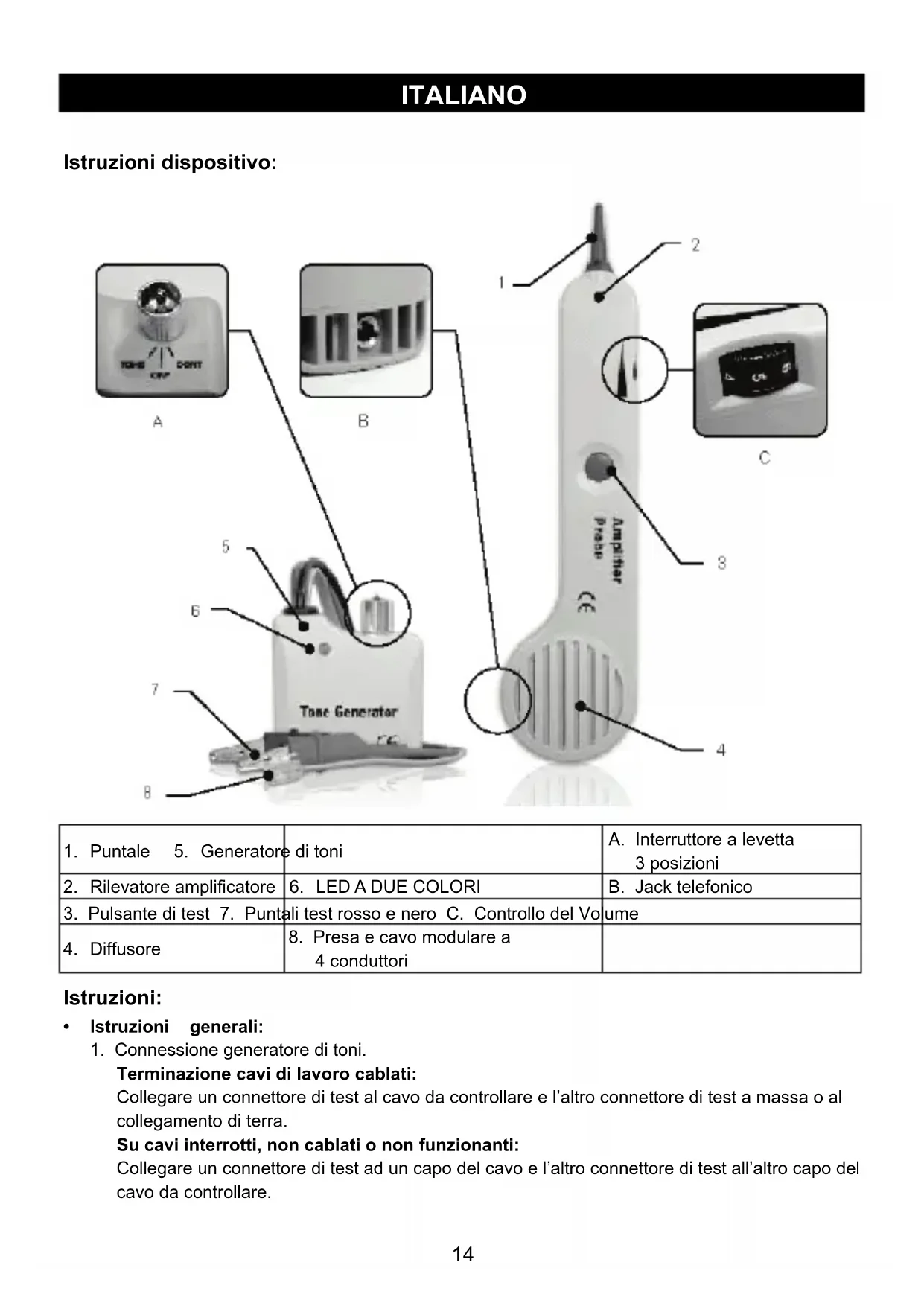 - Per maggiori informazioni, contattate il rivenditore o l'autorità locale responsabile per la gestione dei rifiuti.17 ESPAÑOL Generador de tono y sonda Explicación del aparato: