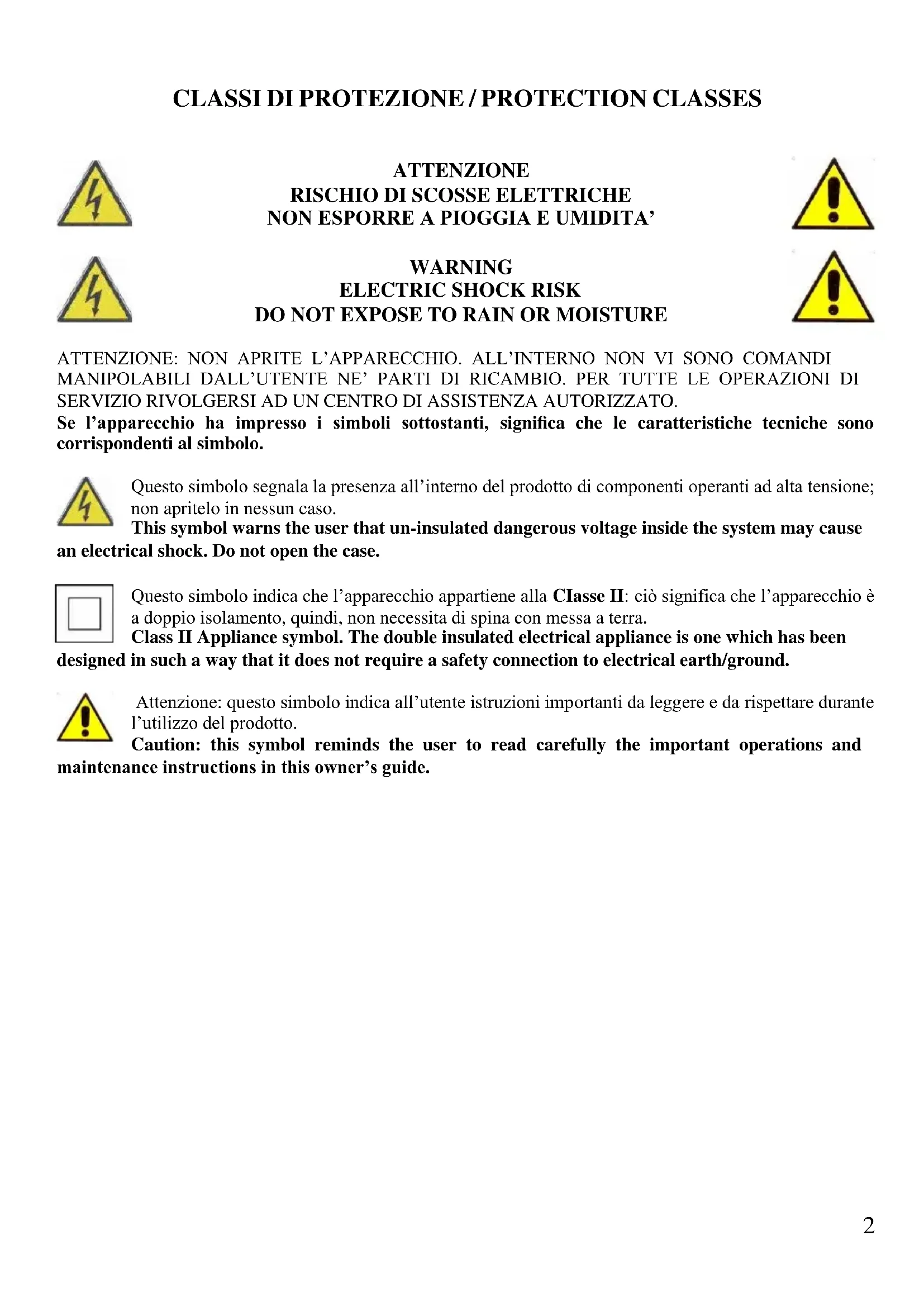 DO NOT EXPOSE TO RAIN OR MOISTURE ATTENZIONE: NON APRITE L’APPARECCHIO. ALL’INTERNO NON VI SONO COMANDI MANIPOLABILI DALL’UTENTE NE’ PARTI DI RICAMBIO. PER TUTTE LE OPERAZIONI DI SERVIZIO RIVOLGERSI AD UN CENTRO DI ASSISTENZA AUTORIZZATO. Se l’apparecchio ha impresso i simboli sottostanti, significa che le caratteristiche tecniche sono corrispondenti al simbolo. Questo simbolo segnala la presenza all’interno del prodotto di componenti operanti ad alta tensione; non apritelo in nessun caso. This symbol warns the user that un-insulated dangerous voltage inside the system may cause an electrical shock. Do not open the case. Questo simbolo indica che l’apparecchio appartiene alla CIasse II: ciò significa che l’apparecchio è a doppio isolamento, quindi, non necessita di spina con messa a terra. Class II Appliance symbol. The double insulated electrical appliance is one which has been designed in such a way that it does not require a safety connection to electrical earth/ground. Attenzione: questo simbolo indica all’utente istruzioni importanti da leggere e da rispettare durante l’utilizzo del prodotto. Caution: this symbol reminds the user to read carefully the important operations and maintenance instructions in this owner’s guide.3