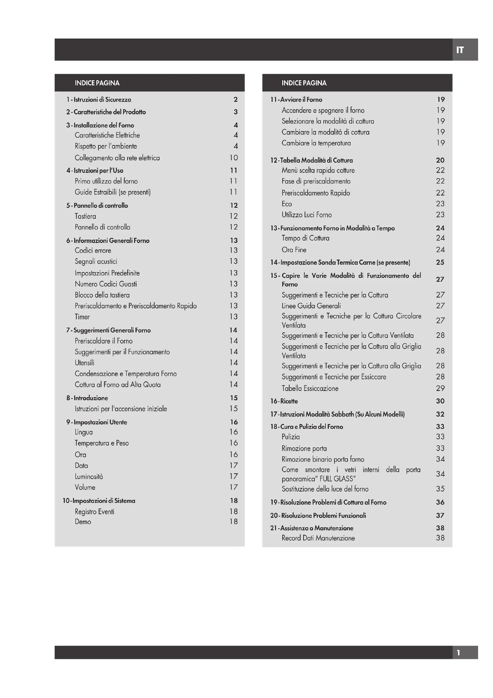 Prima di utilizzare il forno per la prima volta rimuovere tutto l'imballaggio e corpi estranei dal forno(i). Qualunque materiale di questo tipo lasciato all'interno potrebbe fondersi o bruciare durante l'utilizzo dell'elettrodomestico. Codici errore Questo codice appare in caso il controllo elettrico indichi un guasto. Quando appare l'errore, la funzione corrente viene bloccata. Se il tipo di errore è relativo ad una funzione di sicurezza, il forno diventa inutilizzabile e ogni qualvolta si tenti di avviarlo, appare lo stesso errore (nel cui caso chiamare l'assistenza post-vendita), mentre se l'errore riguarda un guasto minore, dopo averlo riavviato, il forno può essere utilizzato per le funzioni che non includono la parte danneggiata (ad es. un elemento riscaldante). Segnali acustici Conferma che il comando è stato ricevuto a seguito della pressione di un tasto. Indica inoltre che una funzione a tempo è stata completata (ad es. Timer o Cottura a Tempo). Durante l'esecuzione di una ricetta, un segnale acustico avverte l'utente che il forno è in attesa di istruzioni da parte dell'utente (ad es. inserire il piatto o girarlo). I segnali acustici segnalano inoltre un guasto del forno. Impostazioni Predefinite Le modalità di cottura selezionano automaticamente una temperatura adatta; quando necessario, questa può essere cambiata. Numero Codici Guasti Tali codici vengono mostrati quando il controllo elettronico rileva un problema nel forno o nell'elettronica. Il codice errore è registrato nel Registro Errori nel Menù impostazioni. Tale errore può essere comunicato al tecnico dell'assistenza cosicché lui/lei possa comprendere le possibili cause del problema in anticipo. Blocco della tastiera Tenere premuto il tasto chiave per 3 secondi. I comandi risulteranno bloccati e verrà mostrata un’icona a forma di chiave. Ripetere la stessa operazione per 3 secondi per sbloccare la tastiera. N. B.: Resta sempre disponibile l’operazione di spegnimento. Preriscaldamento e Preriscaldamento Rapido Ogni qualvolta viene impostata una modalità cottura e il forno si riscalda, si avvia il preriscaldamento; durante tale periodo, viene mostrata la temperatura corrente insieme all'icona del termometro. Non appena raggiunge il 100%, il controllo emette un suono di "fine del preriscaldamento" e il valore della temperatura corrente scompare. Quando è necessario riscaldare il forno rapidamente, è disponibile una modalità di Preriscaldamento Rapido; essa utilizza gli elementi riscaldanti e la ventola di convezione in una maniera specifica al fine di ridurre il più possibile il tempo di riscaldamento. Dopo aver impostato una delle funzioni di cottura per cui è disponibile il preriscaldamento e aver impostato il valore della temperatura desiderata, toccare il tasto , dopo essere entrato nel menù funzioni, selezionare l'icona tramite i tasti e confermare tramite il testo