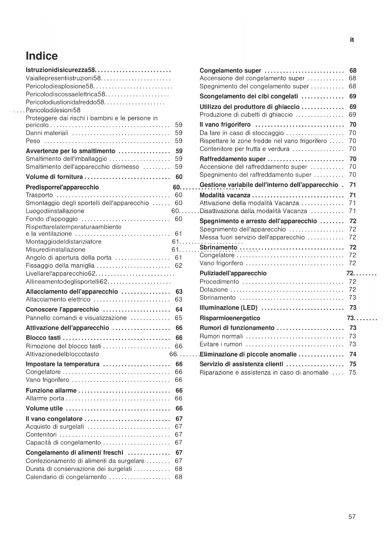 ongelamento dei cibi congelati 69.............. Utilizzo del produttore di ghiaccio 69.............. Produzione di cubetti di ghiaccio 69................ Il vano frigorifero 70............................. Da fare in caso di stoccaggio 70................... Rispettare le zone fredde nel vano frigorifero 70..... Contenitore per frutta e verdura 70................. Raffreddamento super 70......................... Accensione del raffreddamento super 70........... Spegnimento del raffreddamento super 70.......... Gestione variabile dell'interno dell'apparecchio 71. Modalità vacanza 71.............................. Attivazione della modalità Vacanza 71.............. Disattivazione della modalità Vacanza 71........... Spegnimento e arresto dell'apparecchio 72........ Spegnimento dell'apparecchio 72.................. Messa fuori servizio dell'apparecchio 72............ Sbrinamento 72.................................. Congelatore 72................................... Vano frigorifero 72................................ Pulizia dell'apparecchio 72....................... Procedimento 72................................. Dotazione 72..................................... Sbrinamento 73.................................. Illuminazione (LED) 73........................... Risparmio energetico 73.......................... Rumori di funzionamento 73...................... Rumori normali 73................................ Evitare i rumori 73................................ Eliminazione di piccole anomalie 74............... Servizio di assistenza clienti 75................... Riparazione e assistenza in caso di anomalie 75....it