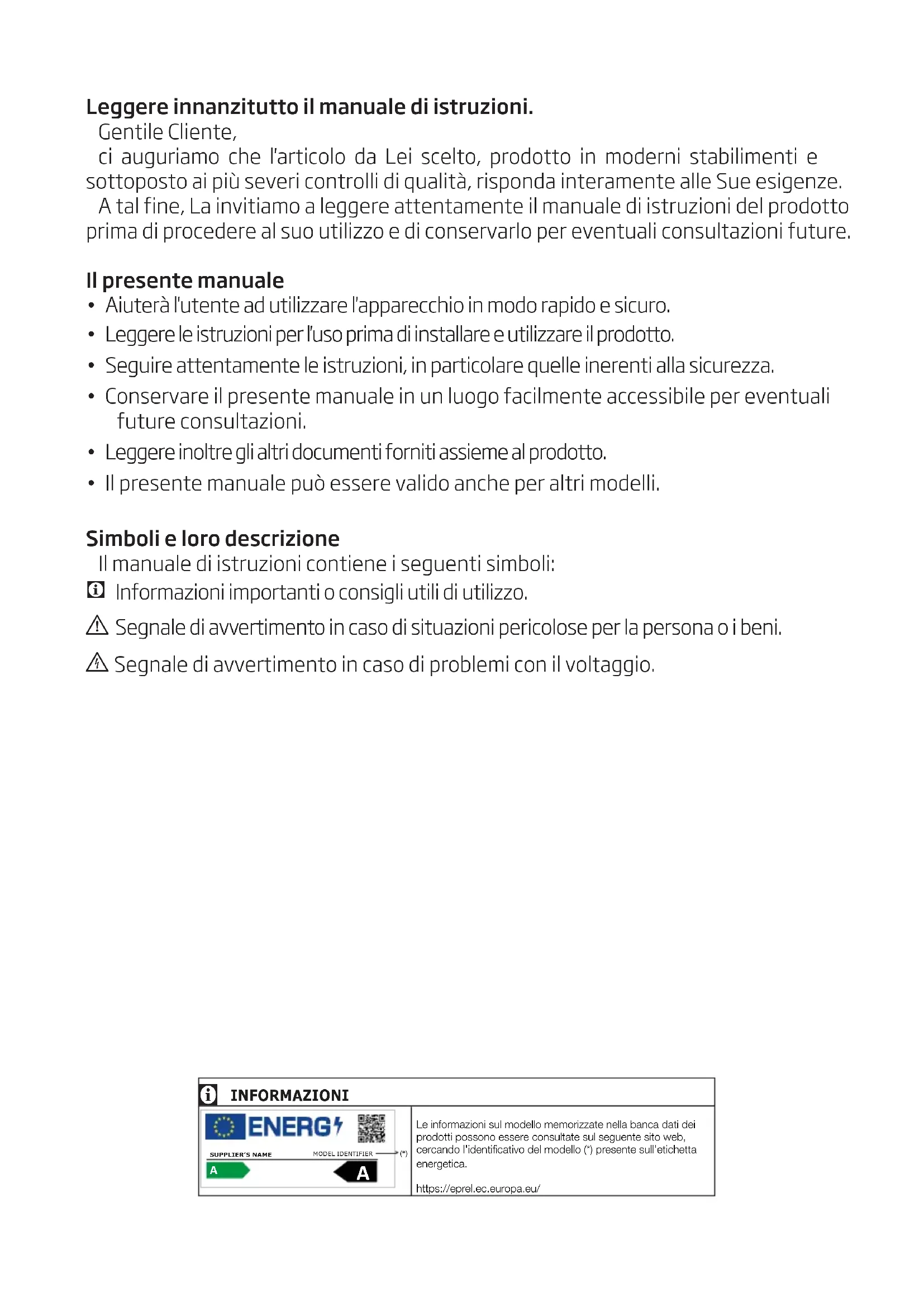 Le informazioni sul modello memorizzate nella banca dati dei prodotti possono essere consultate sul seguente sito web, cercando l'identificativo del modello (*) presente sull'etichetta energetica.https://eprel.ec.europa.eu/