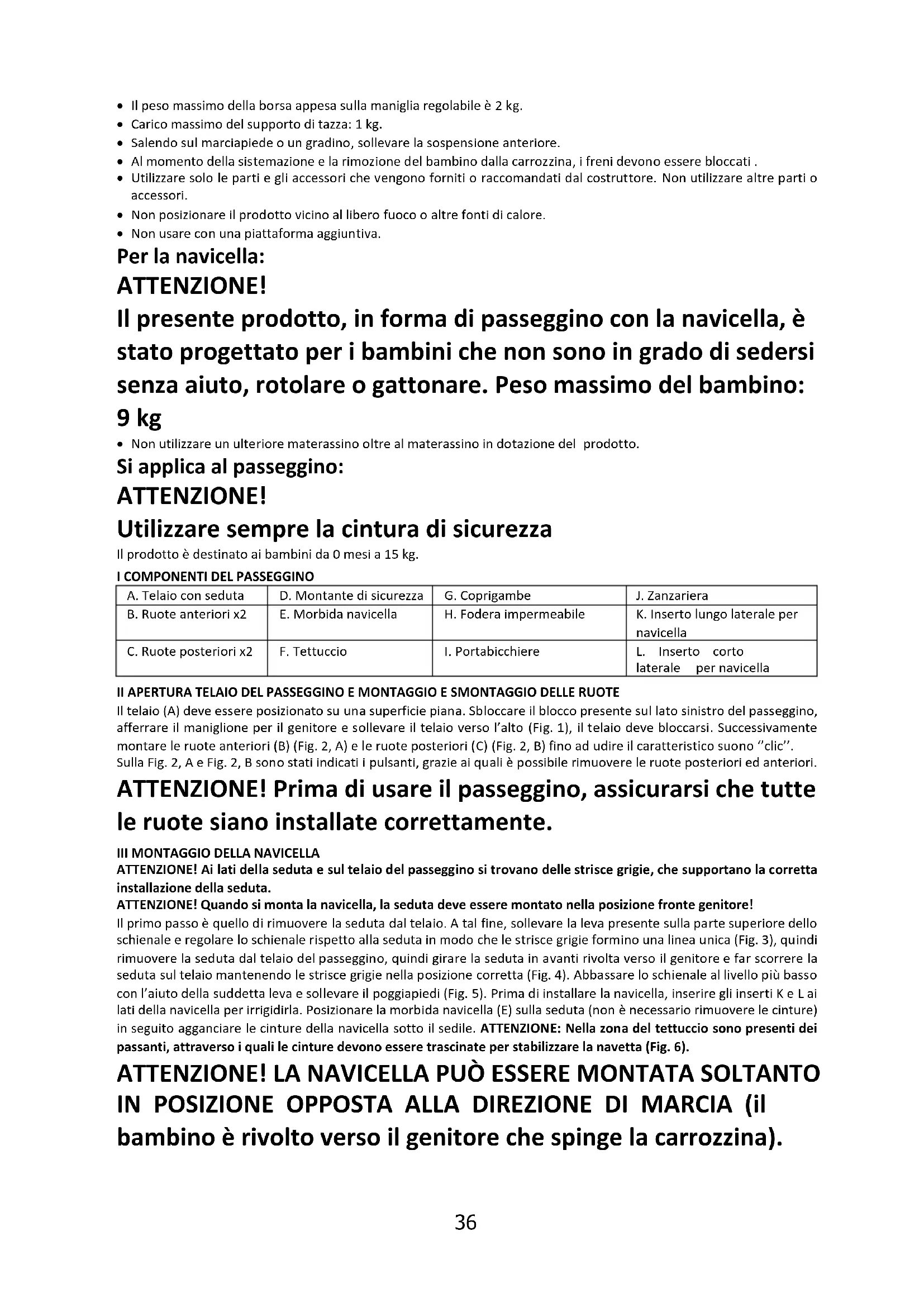 - Non usare con una piattaforma aggiuntiva. Per la navicella: ATTENZIONE! Il presente prodotto, in forma di passeggino con la navicella, è stato progettato per i bambini che non sono in grado di sedersi senza aiuto, rotolare o gattonare. Peso massimo del bambino: 9 kg