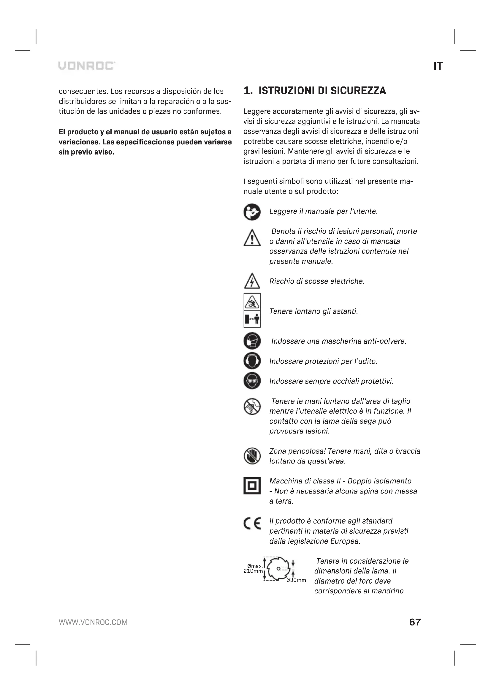 Sono state utilizzate parti di ricambio non originali. Ciò costituisce l’unica garanzia espressa o implicita fornita dall’azienda. Non esistono altre garanzie es- presse o implicite che si estendono oltre il presente documento, ivi comprese le garanzie implicite di commerciabilità e idoneità per uno scopo particola- re. In nessun caso VONROC sarà responsabile di eventuali danni incidentali o consequenziali. I rime- di dei rivenditori saranno limitati alla riparazione o sostituzione di unità o parti non conformi. Il prodotto e il manuale per l’utente sono soggetti a modifiche. I dati tecnici possono essere modificati senza ulteriore notifica.80