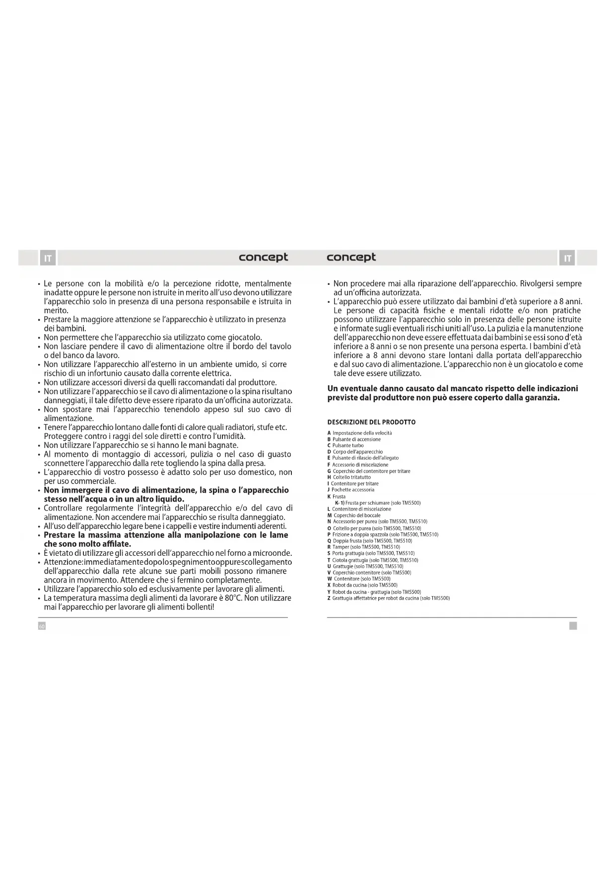 A Impostazione della velocità B Pulsante di accensione C Pulsante turbo D Corpo dell'apparecchio E Pulsante di rilascio dell'allegato F Accessorio di miscelazione G Coperchio del contenitore per tritare H Coltello tritatutto I Contenitore per tritare J Pochette accessoria K Frusta K- 1) Frusta per schiumare (solo TM5500) L Contenitore di miscelazione M Coperchio del boccale N Accessorio per purea (solo TM5500, TM5510) O Coltello per purea (solo TM5500, TM5510) P Frizione a doppia spazzola (solo TM5500, TM5510) Q Doppia frusta (solo TM5500, TM5510) R Tamper (solo TM5500, TM5510) S Porta grattugia (solo TM5500, TM5510) T Ciotola grattugia (solo TM5500, TM5510) U Grattugie (solo TM5500, TM5510) V Coperchio contenitore (solo TM5500) W Contenitore (solo TM5500) X Robot da cucina (solo TM5500) Y Robot da cucina - grattugia (solo TM5500) Z Grattugia affettatrice per robot da cucina (solo TM5500)62 63 ITIT