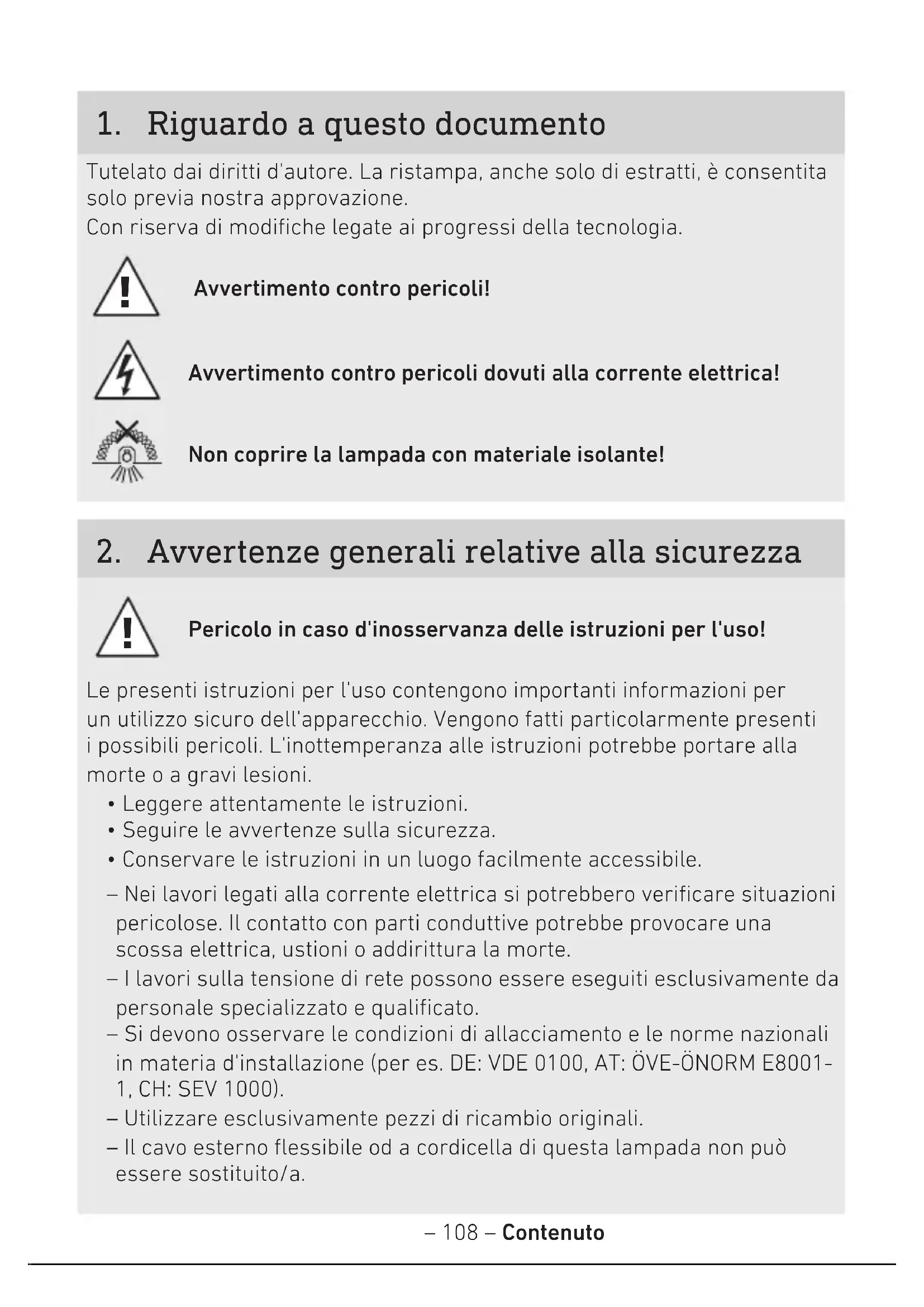 - Conservare le istruzioni in un luogo facilmente accessibile. – Nei lavori legati alla corrente elettrica si potrebbero verificare situazioni pericolose. Il contatto con parti conduttive potrebbe provocare una scossa elettrica, ustioni o addirittura la morte. – I lavori sulla tensione di rete possono essere eseguiti esclusivamente da personale specializzato e qualificato. – Si devono osservare le condizioni di allacciamento e le norme nazionali in materia d'installazione (per es. DE: VDE 0100, AT: ÖVE-ÖNORM E8001- 1, CH:SEV 1000). – Utilizzare esclusivamente pezzi di ricambio originali. – Il cavo esterno flessibile od a cordicella di questa lampada non può essere sostituito/a.– 109 – Contenuto