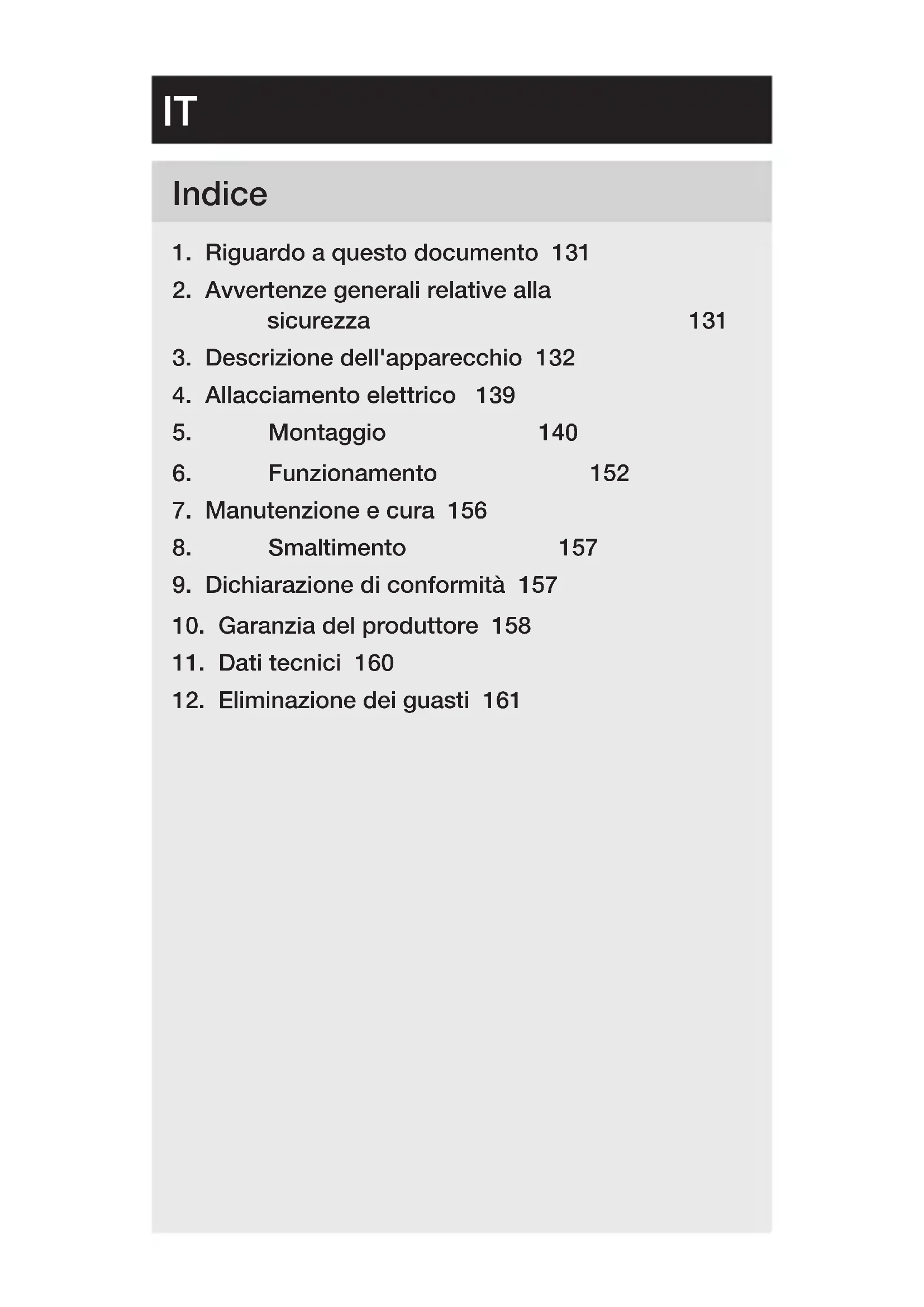 - Controllare tutti i componenti per verificare se presen- tano danneggiamenti. In caso di danni non mettete in funzione il prodotto.IT – 141 – Indice