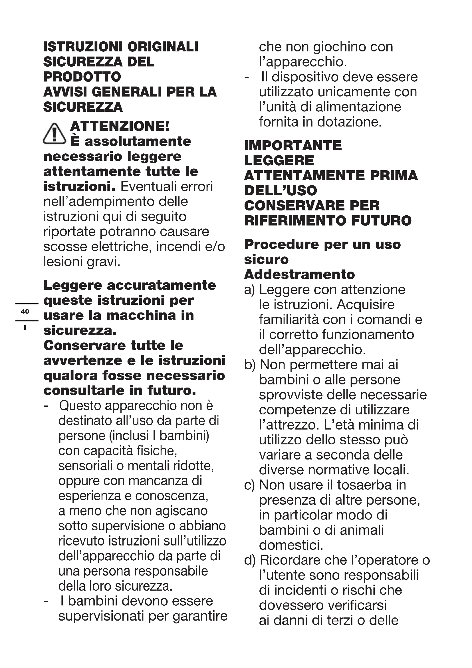 SICUREZZA ATTENZIONE! È assolutamente necessario leggere attentamente tutte le istruzioni. Eventuali errori nell’adempimento delle istruzioni qui di seguito riportate potranno causare scosse elettriche, incendi e/o lesioni gravi. Leggere accuratamente queste istruzioni per usare la macchina in sicurezza. Conservare tutte le avvertenze e le istruzioni qualora fosse necessario consultarle in futuro. - Questo apparecchio non è destinato all’uso da parte di persone (inclusi I bambini) con capacità siche, sensoriali o mentali ridotte, oppure con mancanza di esperienza e conoscenza, a meno che non agiscano sotto supervisione o abbiano ricevuto istruzioni sull’utilizzo dell’apparecchio da parte di una persona responsabile della loro sicurezza. - I bambini devono essere supervisionati per garantire che non giochino con l’apparecchio. - Il dispositivo deve essere utilizzato unicamente con l’unità di alimentazione fornita in dotazione. IMPORTANTE LEGGERE ATTENTAMENTE PRIMA DELL’USO CONSERVARE PER RIFERIMENTO FUTURO Procedure per un uso sicuro Addestramento a) Leggere con attenzione le istruzioni. Acquisire familiarità con i comandi e il corretto funzionamento dell’apparecchio. b) Non permettere mai ai bambini o alle persone sprovviste delle necessarie competenze di utilizzare l’attrezzo. L’età minima di utilizzo dello stesso può variare a seconda delle diverse normative locali. c) Non usare il tosaerba in presenza di altre persone, in particolar modo di bambini o di animali domestici. d) Ricordare che l’operatore o l’utente sono responsabili di incidenti o rischi che dovessero vericarsi ai danni di terzi o delle41