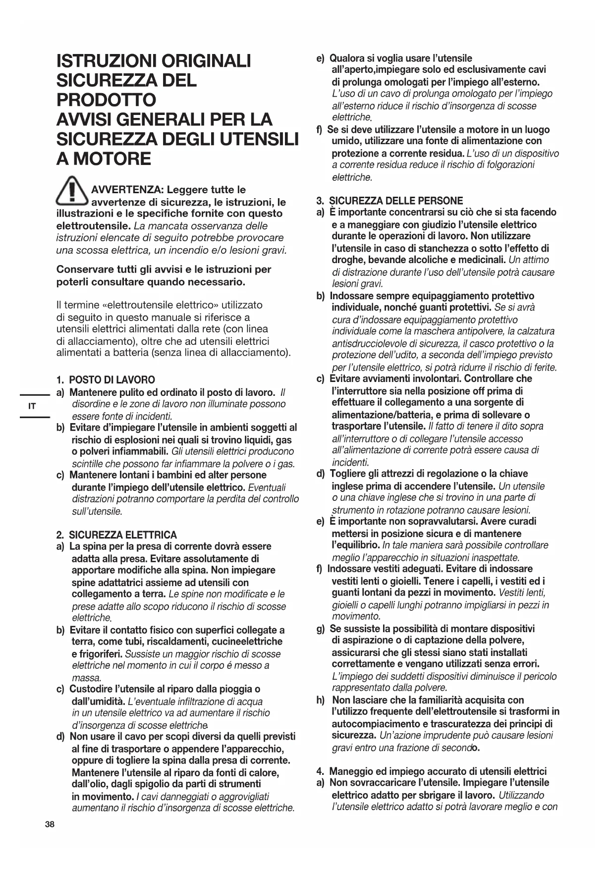 maggior sicurezza nell’ambito della gamma di potenza indicata. b) Non utilizzare utensili elettrici con interruttori difettosi. Un utensile elettrico che non si può più accendere o spegnere è pericoloso e dovrà essere riparato. c) Scollegare la spina dalla sorgente di alimentazione e/o la batteria dall’utensile prima di effettuare regolazione, cambiare accessori, o riporre gli utensili a motore . Tale precauzione eviterà che l’apparecchio possa essere messo in funzione inavvertitamente. d) Custodire gli utensili elettrici non utilizzati al di fuori della portata dei bambini. Non fare usare l’apparecchio a persone che non sono abituate ad usarlo o che non abbiano letto le presenti istruzioni. Gli utensili elettrici sono pericolosi se utilizzati da persone inesperte. e) Effettuare accuratamente la manutenzione dell’apparecchio. Verificare che le parti mobili dello strumento funzionino perfettamente e non s’inceppino, che non ci siano pezzi rotti o danneggiati al punto tale da limitare la funzione dell’apparecchio stesso. Far riparare le parti danneggiate prima d’impiegare l’apparecchio. Numerosi incidenti vengono causati da utensili elettrici la cui manutenzione è stata effettuata poco accuratamente. f) Mantenere affilati e puliti gli utensili da taglio. Gli utensili da taglio curati con particolare attenzione e con taglienti aflati s’inceppano meno frequentemente e sono più facili da condurre. g) Utilizzare utensili elettric i, accessori, attrezzi,ecc. in conformità con le presenti istruzioni e secondo quanto previsto per questo tipo specifico di apparecchio. Osservare le condizioni di lavoro ed il lavoro da eseguirsi durante l’impiego. L’impiego di utensili elettrici per usi diversi da quelli consentiti potrà dar luogo a situazioni di pericolo. h) Mantenere le impugnature e le superfici di presa asciutte, pulite e prive di olio e grasso.