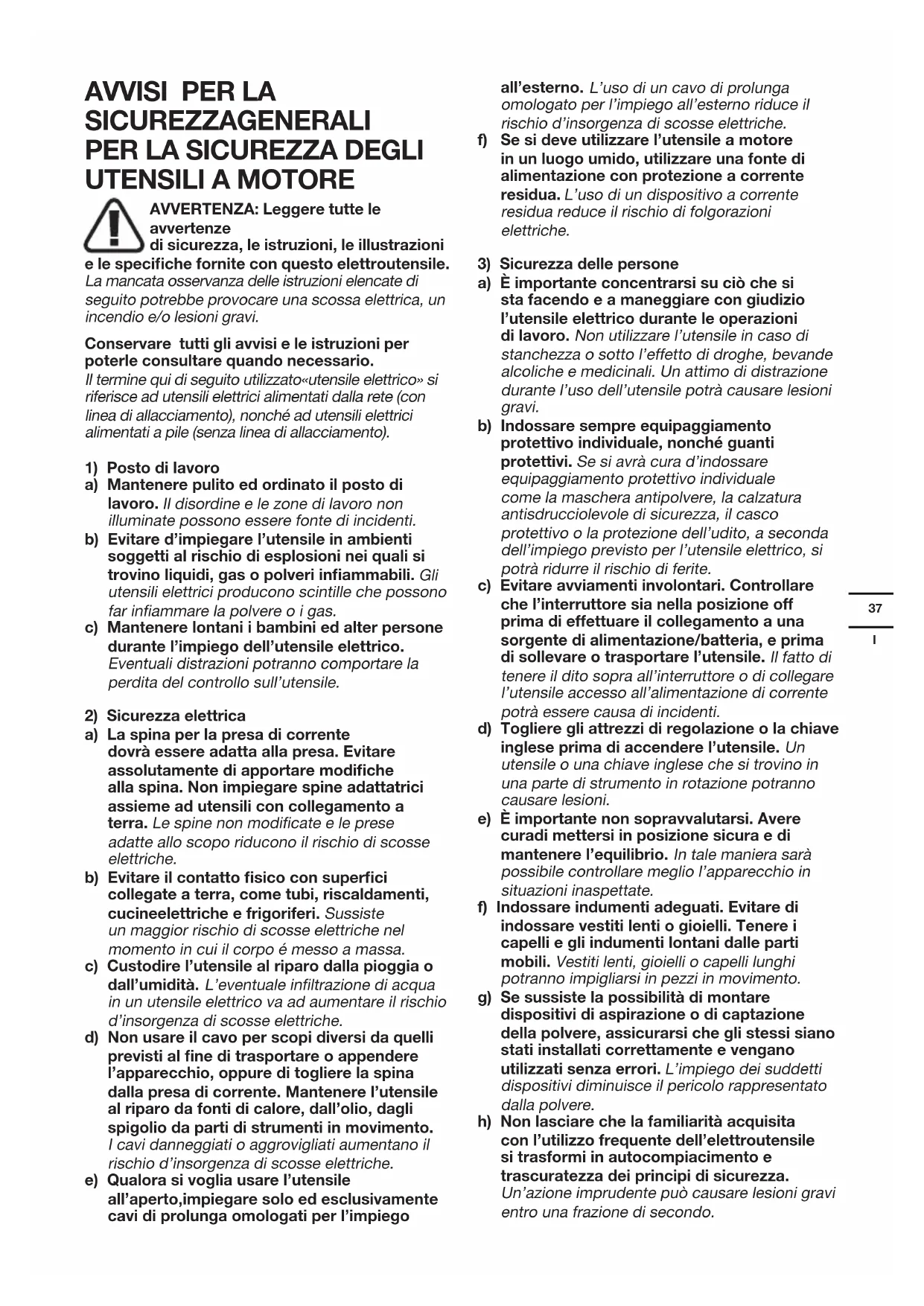 elettrici a) Non sovraccaricare l’utensile. Impiegare l’utensile elettrico adatto per sbrigare il lavoro. Utilizzando l’utensile elettrico adatto si potrà lavorare meglio e con maggior sicurezza nell’ambito della gamma di potenza indicata. b) Non utilizzare utensili elettrici con interruttori difettosi. Un utensile elettrico che non si può più accendere o spegnere è pericoloso e dovrà essere riparato. c) Scollegare la spina dalla sorgente di alimentazione e/o la batteria dall’utensile prima di effettuare regolazione, cambiare accessori, o riporre gli utensili a motore. Tale precauzione eviterà che l’apparecchio possa essere messo in funzione inavvertitamente. d) Custodire gli utensili elettrici non utilizzati al di fuori della portata dei bambini. Non fare usare l’apparecchio a persone che non sono abituate ad usarlo o che non abbiano letto le presenti istruzioni. Gli utensili elettrici sono pericolosi se utilizzati da persone inesperte. e) Effettuare accuratamente la manutenzione dell’apparecchio. Verificare che le parti mobili dello strumento funzionino perfettamente e non s’inceppino, che non ci siano pezzi rotti o danneggiati al punto tale da limitare la funzione dell’apparecchio stesso. Far riparare le parti danneggiate prima d’impiegare l’apparecchio. Numerosi incidenti vengono causati da utensili elettrici la cui manutenzione è stata effettuata poco accuratamente. f) Mantenere affilati e puliti gli utensili da taglio. Gli utensili da taglio curati con particolare attenzione e con taglienti aflati s’inceppano meno frequentemente e sono più facili da condurre. g) Utilizzare utensili elettrici, accessori, attrezzi,ecc. in conformità con le presenti istruzioni e secondo quanto previsto per questo tipo specifico di apparecchio. Osservare le condizioni di lavoro ed il lavoro da eseguirsi durante l’impiego. L’impiego di utensili elettrici per usi diversi da quelli consentiti potrà dar luogo a situazioni di pericolo. h) Mantenere le impugnature e le superfici di presa asciutte, pulite e prive di olio e grasso. Le impugnature e le superci di presa scivolose non permettono l’uso e il controllo sicuri dell’elettroutensile in situazioni impreviste.