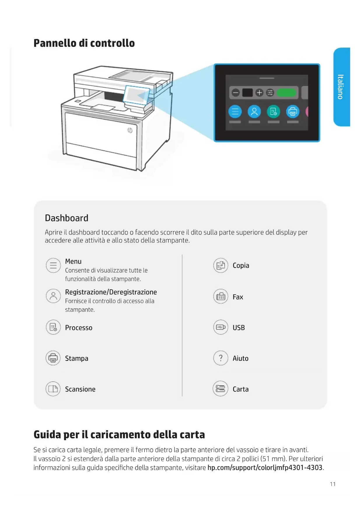 Druckersoftware und versuchen Sie erneut, eine Verbindung herzustellen.11 Pannello di controllo Guida per il caricamento della carta Se si carica carta legale, premere il fermo dietro la parte anteriore del vassoio e tirare in avanti. Ilvassoio 2 si estenderà dalla parte anteriore della stampante di circa 2 pollici (51 mm). Per ulteriori informazioni sulla guida speciche della stampante, visitare hp.com/support/colorljmfp4301-4303. Dashboard Aprire il dashboard toccando o facendo scorrere il dito sulla parte superiore del display per accedere alle attività e allo stato della stampante. Menu Consente di visualizzare tutte le funzionalità della stampante. Registrazione/Deregistrazione Fornisce il controllo di accesso alla stampante. Processo Stampa Scansione Copia Fax USB Aiuto Carta Italiano12 Italiano Caratteristiche della stampante
