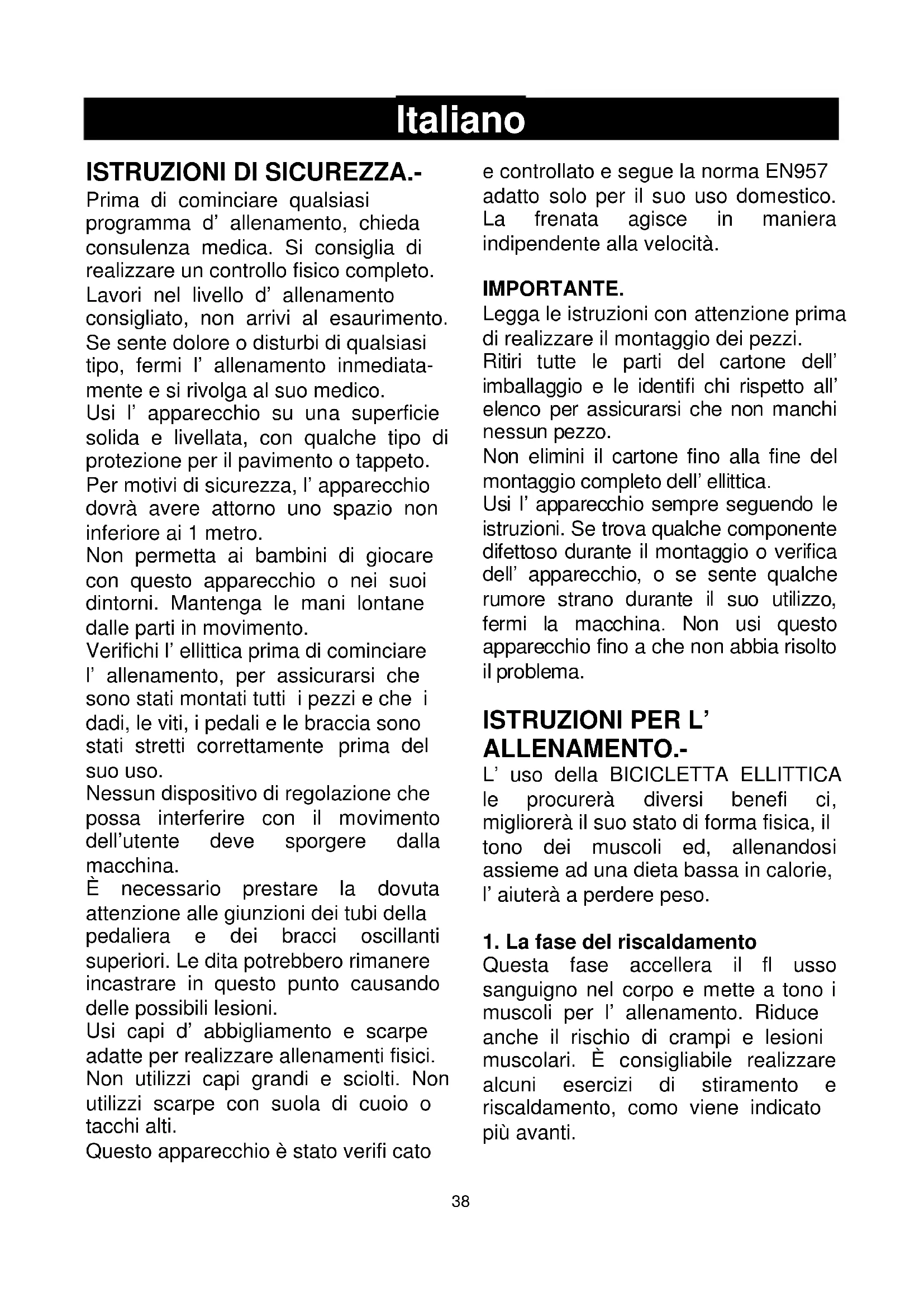 Prima di cominciare qualsiasi programma d’ allenamento, chieda consulenza medica. Si consiglia di realizzare un controllo fisico completo. Lavori nel livello d’ allenamento consigliato, non arrivi al esaurimento. Se sente dolore o disturbi di qualsiasi tipo, fermi l’ allenamento inmediata- mente e si rivolga al suo medico. Usi l’ apparecchio su una superficie solida e livellata, con qualche tipo di protezione per il pavimento o tappeto. Per motivi di sicurezza, l’ apparecchio dovrà avere attorno uno spazio non inferiore ai 1 metro. Non permetta ai bambini di giocare con questo apparecchio o nei suoi dintorni. Mantenga le mani lontane dalle parti in movimento. Verifichi l’ ellittica prima di cominciare l’ allenamento, per assicurarsi che sono stati montati tutti i pezzi e che i dadi, le viti, i pedali e le braccia sono stati stretti correttamente prima del suo uso. Nessun dispositivo di regolazione che possa interferire con il movimento dell’utente deve sporgere dalla macchina. È necessario prestare la dovuta attenzione alle giunzioni dei tubi della pedaliera e dei bracci oscillanti superiori. Le dita potrebbero rimanere incastrare in questo punto causando delle possibili lesioni. Usi capi d’ abbigliamento e scarpe adatte per realizzare allenamenti fisici. Non utilizzi capi grandi e sciolti. Non utilizzi scarpe con suola di cuoio o tacchi alti. Questo apparecchio è stato verifi cato e controllato e segue la norma EN957 adatto solo per il suo uso domestico. La frenata agisce in maniera indipendente alla velocità. IMPORTANTE. Legga le istruzioni con attenzione prima di realizzare il montaggio dei pezzi. Ritiri tutte le parti del cartone dell’ imballaggio e le identifi chi rispetto all’ elenco per assicurarsi che non manchi nessun pezzo. Non elimini il cartone fino alla fine del montaggio completo dell’ ellittica. Usi l’ apparecchio sempre seguendo le istruzioni. Se trova qualche componente difettoso durante il montaggio o verifica dell’ apparecchio, o se sente qualche rumore strano durante il suo utilizzo, fermi la macchina. Non usi questo apparecchio fino a che non abbia risolto il problema.