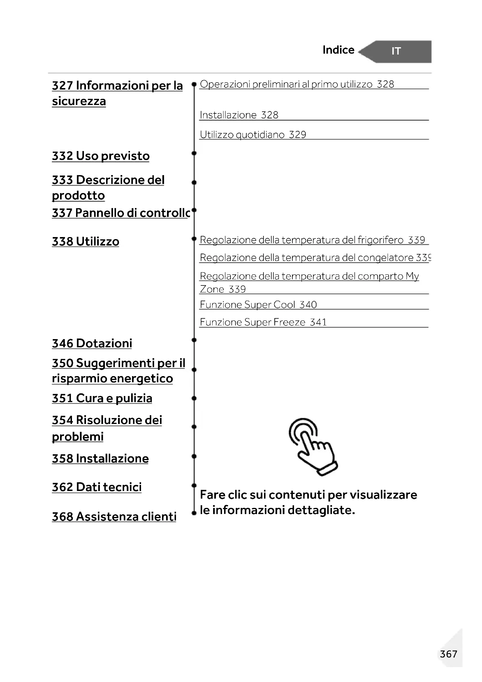 - További országokért látogasson el a www.haier.com oldalra Haier Europe Trading S.r.l Branch UK Westgate House, Westgate, Ealing London, W5 1YY *A hűtőszekrény jótállásának időtartama: Minimális jótállás: 2 év az uniós tagállamokban, 3 év Törökországban, 1 év az Egyesült Királyságban, 1 év Oroszországban, 3 év Svédországban, 2 év Szerbiában, 5 év Norvégiában, 1 év Marokkóban, 6 hónap Algériában, Tunézia nincs kötelező jogi jótállás. *A készülék javításához szükséges pótalkatrészek rendelkezésre állásának időtartama: Termosztátok, hőmérséklet érzékelők, nyomtatott áramköri lapok és fényforrások legalább hét évig elérhetők a piacra bocsátott utolsó modelltől számítva. Ajtófogantyúk, ajtópántok, tálcák és kosarak legalább hét évig, míg ajtótömítések legalább 10 évig elérhetők a piacra bocsátott utolsó modelltől számítva. *A termékre vonatkozó további tájékoztatás ügyében tekintse meg az https://eprel.ec.europe.eu/ oldalt, vagy olvassa be a készüléken elhelyezett, energiafogyasztást jelölő címkén található QR-kódot. 3652023, A verzióIT Indice 327 Informazioni per la sicurezza Operazioni preliminari al primo utilizzo 328 Installazione 328 Utilizzo quotidiano 329 332 Uso previsto 333 Descrizione del prodotto 337 Pannello di controllo 338 Utilizzo Regolazione della temperatura del frigorifero 339 Regolazione della temperatura del congelatore 339 Regolazione della temperatura del comparto My Zone 339 Funzione Super Cool 340 Funzione Super Freeze 341 346 Dotazioni 350 Suggerimenti per il risparmio energetico 351 Cura e pulizia 354 Risoluzione dei problemi 358 Installazione 362 Dati tecnici Fare clic sui contenuti per visualizzare le informazioni dettagliate. 368 Assistenza clienti 367IT Grazie Grazie per aver acquistato un prodotto Haier. Leggere attentamente queste istruzioni prima di utilizzare l'elettrodomestico. Le istruzioni contengono informazioni importanti per ottimizzare l'uso dell'elettrodomestico e garantire l'installazione, l'uso e la manutenzione sicuri e corretti. Conservare il presente manuale in un luogo comodo, in modo da poterlo sempre consultare per un uso sicuro e corretto dell'elettrodomestico. Se l'elettrodomestico viene venduto, ceduto o abbandonato in caso di trasloco, trasferire anche il presente manuale in modo che il nuovo proprietario possa comprendere l'uso dell'elettrodomestico e delle avvertenze di sicurezza. Accessori Controllare gli accessori e la documentazione in base al seguente elenco: Vassoio per le uova Etichetta energetica Scheda della garanzia Manuale per l'utente Vassoio per ghiaccio in cubetti Cerniere dello sportello Coperchio della cerniera Inserto del cappuccio 368IT Informazioni per la sicurezza Informazi oni per la sicurezza AVVERTENZA - Informazioni importanti per la sicurezza AVVISO - Informazioni generali e consigli Informazioni ambientali Smaltimento Contribuire a proteggere l'ambiente e la salute umana. Collocare l'imballo in appositi contenitori affinché venga riciclato. Contribuire al riciclo dei rifiuti delle apparecchiature elettriche ed elettroniche. Non smaltire gli elettrodomestici contrassegnati con questo simbolo assieme ai rifiuti domestici. Conferire il prodotto presso la struttura di riciclo locale o rivolgersi all'ufficio comunale preposto. AVVERTENZA! Pericolo di lesioni o soffocamento! I refrigeranti e i gas devono essere smaltiti in maniera professionale. Accertarsi che la tubazione del circuito del refrigerante non sia danneggiata prima di smaltirla correttamente. Scollegare l'elettrodomestico dalla rete elettrica. Tagliare il cavo di alimentazione e smaltirlo. Rimuovere vassoi e cassetti, fermaporte e guarnizioni, per evitare che bambini e animali domestici rimangano chiusi nell'elettrodomestico. 369IT Informazioni per la sicurezza Prima di accendere l'elettrodomestico per la prima volta, leggere i seguenti consigli sulla sicurezza: AVVERTENZA! Operazioni preliminari al primo utilizzo ► Accertarsi dell'assenza di danni dovuti al trasporto.► Rimuovere tutti gli elementi di imballo e tenerli fuori dalla portata dei bambini.► Per garantire la totale efficienza del circuito del refrigerante, attendere almeno due ore prima di installare l'elettrodomestico. ► L'elettrodomestico deve essere maneggiato sempre da almeno due persone perché è pesante. Installazione ► Installare l'elettrodomestico in un luogo asciutto e ben ventilato. Lasciare uno spazio libero di almeno 10 cm sopra e attorno all'elettrodomestico. ► Non collocare mai l'elettrodomestico in zone umide o soggette a schizzi d'acqua. Pulire e asciugare schizzi e macchie d'acqua con un panno morbido e pulito. ► Non installare l'elettrodomestico esposto alla luce diretta del sole o in prossimità di fonti di calore (ad es. stufe o radiatori). ► Installare l'elettrodomestico a livello in un'area adatta alle dimensioni e all'uso. ► Le aperture di ventilazione nell'elettrodomestico o nella struttura a incasso devono rimanere sempre libere. ► Accertarsi che i dati elettrici sulla targhetta siano conformi all'alimentazione elettrica. In caso contrario, rivolgersi a un elettricista. ► L'elettrodomestico funziona con corrente elettrica 220-240 Vca / 50 Hz. Oscillazioni anomale della tensione possono causare il mancato avvio dell'elettrodomestico, danni al controllo della temperatura o al compressore oppure rumori anomali durante il funzionamento. In tal caso, è opportuno montare un regolatore automatico. ► Non adoperare prese multiple o cavi di prolunga.► Non collocare prese multiple o alimentatori portatili nella parte posteriore dell'elettrodomestico. ► Accertarsi che il cavo di alimentazione non sia intrappolato dal frigorifero. Non calpestare il cavo di alimentazione. 370IT Informazioni per la sicurezza AVVERTENZA! ► Per l'alimentazione elettrica utilizzare una presa separata collegata a terra e facilmente accessibile. L