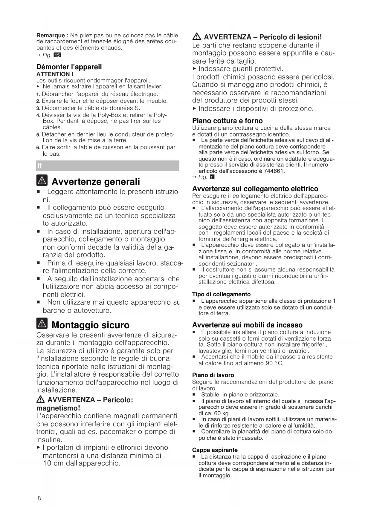 I portatori di impianti elettronici devono mantenersi a una distanza minima di 10cm dall'apparecchio. AVVERTENZA‒Pericolo di lesioni! Le parti che restano scoperte durante il montaggio possono essere appuntite e cau- sare ferite da taglio.