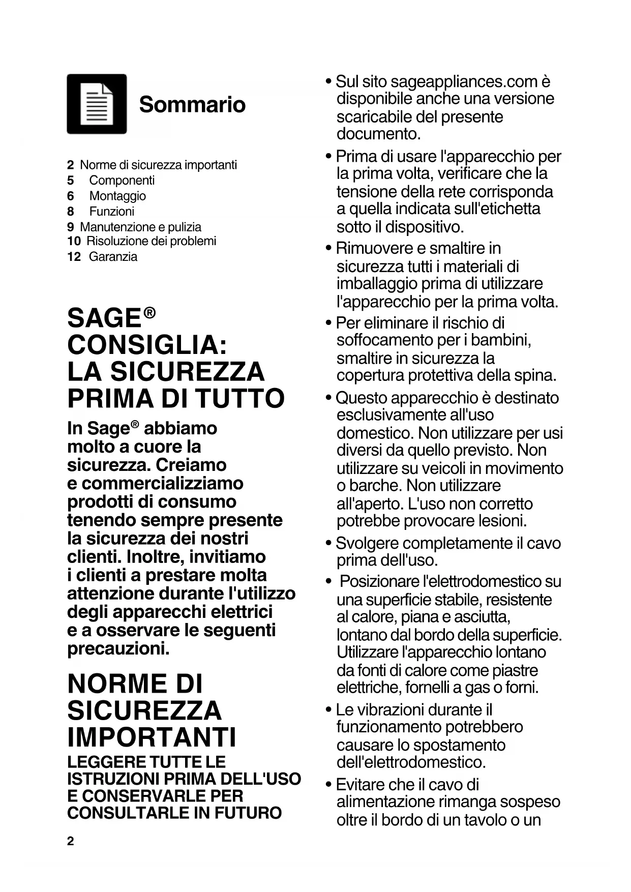 2 Norme di sicurezza importanti5 Componenti6 Montaggio8 Funzioni9 Manutenzione e pulizia10 Risoluzione dei problemi12 Garanzia Sommario SAGE