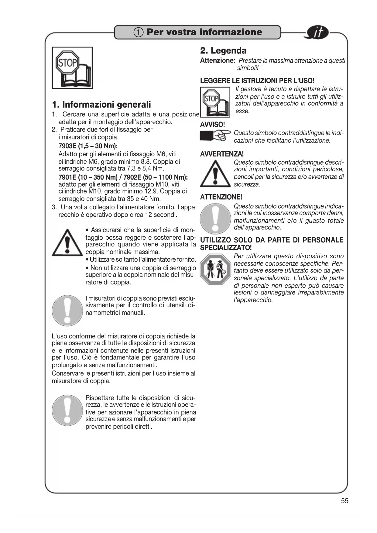 ratore di coppia. I misuratori di coppia sono previsti esclu- sivamente per il controllo di utensili di- namometrici manuali. L'uso conforme del misuratore di coppia richiede la piena osservanza di tutte le disposizioni di sicurezza e le informazioni contenute nelle presenti istruzioni per l'uso. Ciò è fondamentale per garantire l'uso prolungato e senza malfunzionamenti. Conservare le presenti istruzioni per l'uso insieme al misuratore di coppia. Rispettare tutte le disposizioni di sicu- rezza, le avvertenze e le istruzioni opera- tive per azionare l'apparecchio in piena sicurezza e senza malfunzionamenti e per prevenire pericoli diretti.