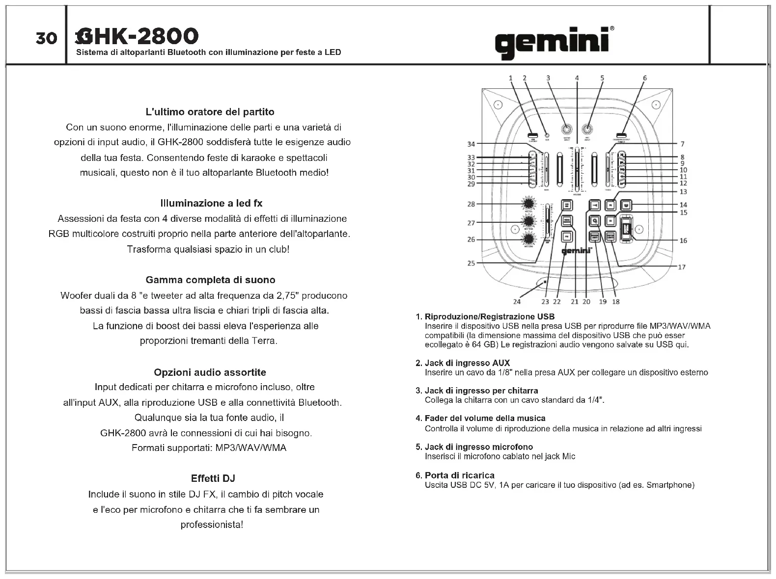 GHK-2800 Bluetooth -Lautsprechersystem mit LED -Partybeleuchtung30 31 GHK-2800 Sistema di altoparlanti Bluetooth con illuminazione per feste a LED1. Riproduzione/Registrazione USB Inserire il dispositivo USB nella presa USB per riprodurre file MP3/WAV/WMA compatibili (la dimensione massima del dispositivo USB che può esser ecollegato è 64 GB) Le registrazioni audio vengono salvate su USB qui.2. Jack di ingresso AUX Inserire un cavo da 1/8" nella presa AUX per collegare un dispositivo esterno3. Jack di ingresso per chitarra Collega la chitarra con un cavo standard da 1/4".4. Fader del volume della musica Controlla il volume di riproduzione della musica in relazione ad altri ingressi5. Jack di ingresso microfono Inserisci il microfono cablato nel jack Mic6. Porta di ricarica Uscita USB DC 5V, 1A per caricare il tuo dispositivo (ad es. Smartphone) L'ultimo oratore del partito Con un suono enorme, l'illuminazione delle parti e una varietà di opzioni di input audio, il GHK-2800 soddisferà tutte le esigenze audio della tua festa. Consentendo feste di karaoke e spettacoli musicali, questo non è il tuo altoparlante Bluetooth medio! Illuminazione a led fx Assessioni da festa con 4 diverse modalità di effetti di illuminazione RGB multicolore costruiti proprio nella parte anteriore dell'altoparlante. Trasforma qualsiasi spazio in un club! Gamma completa di suono Woofer duali da 8 "e tweeter ad alta frequenza da 2,75" producono bassi di fascia bassa ultra liscia e chiari tripli di fascia alta. La funzione di boost dei bassi eleva l'esperienza alle proporzioni tremanti della Terra. Opzioni audio assortite Input dedicati per chitarra e microfono incluso, oltre all'input AUX, alla riproduzione USB e alla connettività Bluetooth. Qualunque sia la tua fonte audio, il GHK-2800 avrà le connessioni di cui hai bisogno. Formati supportati: MP3/WAV/WMA Effetti DJ Include il suono in stile DJ FX, il cambio di pitch vocale e l'eco per microfono e chitarra che ti fa sembrare un professionista!32 33