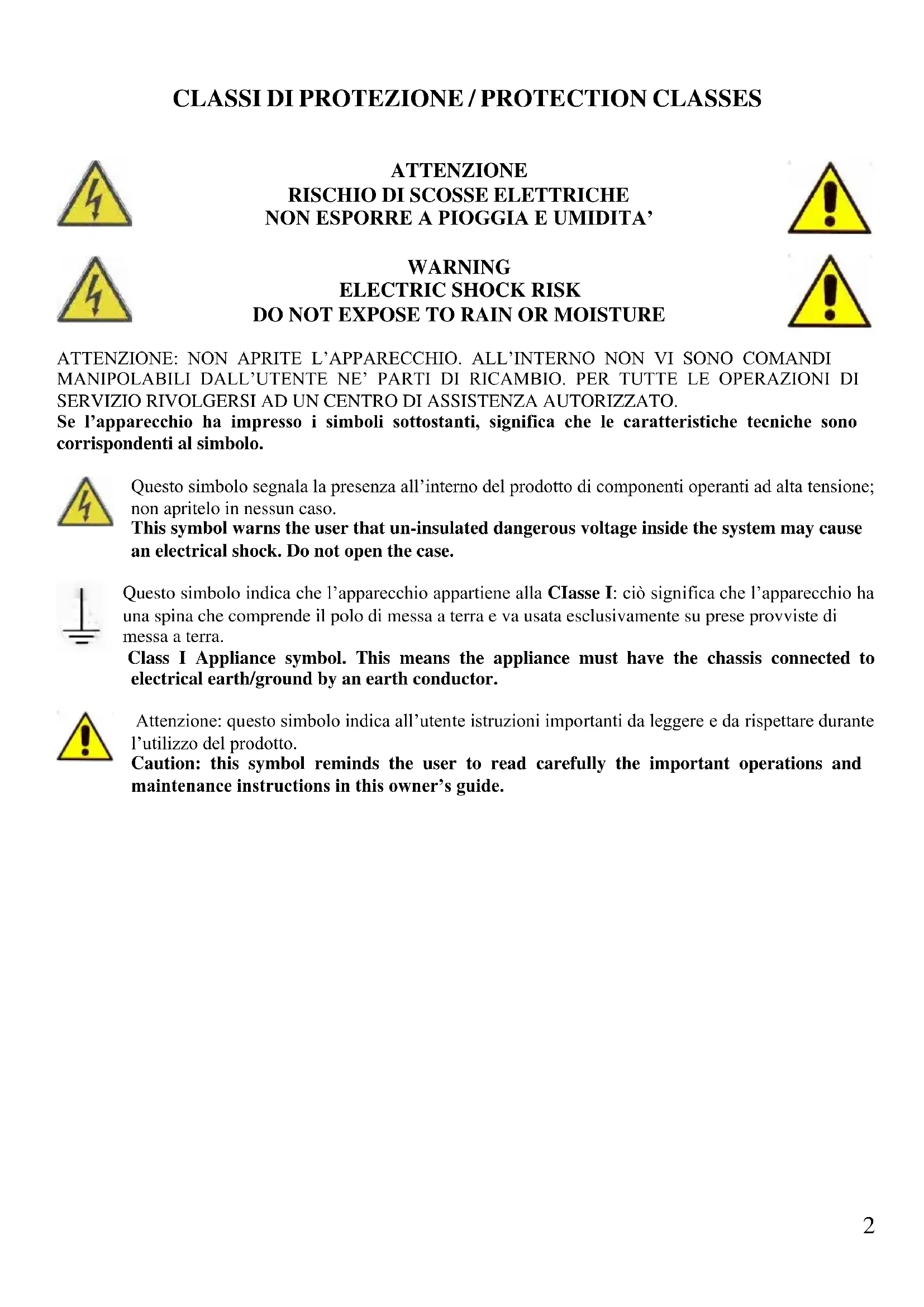 DO NOT EXPOSE TO RAIN OR MOISTURE ATTENZIONE: NON APRITE L’APPARECCHIO. ALL’INTERNO NON VI SONO COMANDI MANIPOLABILI DALL’UTENTE NE’ PARTI DI RICAMBIO. PER TUTTE LE OPERAZIONI DI SERVIZIO RIVOLGERSI AD UN CENTRO DI ASSISTENZA AUTORIZZATO. Se l’apparecchio ha impresso i simboli sottostanti, significa che le caratteristiche tecniche sono corrispondenti al simbolo. Questo simbolo segnala la presenza all’interno del prodotto di componenti operanti ad alta tensione; non apritelo in nessun caso. This symbol warns the user that un-insulated dangerous voltage inside the system may cause an electrical shock. Do not open the case. Questo simbolo indica che l’apparecchio appartiene alla CIasse I: ciò significa che l’apparecchio ha una spina che comprende il polo di messa a terra e va usata esclusivamente su prese provviste di messa a terra. Class I Appliance symbol. This means the appliance must have the chassis connected to electrical earth/ground by an earth conductor. Attenzione: questo simbolo indica all’utente istruzioni importanti da leggere e da rispettare durante l’utilizzo del prodotto. Caution: this symbol reminds the user to read carefully the important operations and maintenance instructions in this owner’s guide.3