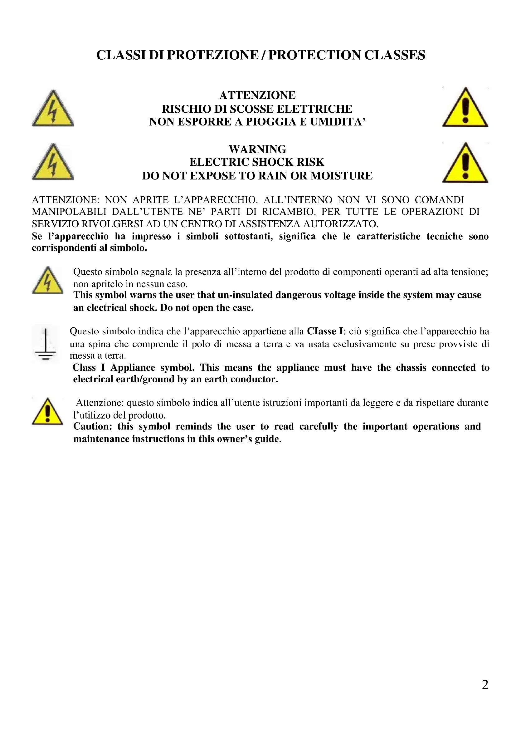 DO NOT EXPOSE TO RAIN OR MOISTURE ATTENZIONE: NON APRITE L’APPARECCHIO. ALL’INTERNO NON VI SONO COMANDI MANIPOLABILI DALL’UTENTE NE’ PARTI DI RICAMBIO. PER TUTTE LE OPERAZIONI DI SERVIZIO RIVOLGERSI AD UN CENTRO DI ASSISTENZA AUTORIZZATO. Se l’apparecchio ha impresso i simboli sottostanti, significa che le caratteristiche tecniche sono corrispondenti al simbolo. Questo simbolo segnala la presenza all’interno del prodotto di componenti operanti ad alta tensione; non apritelo in nessun caso. This symbol warns the user that un-insulated dangerous voltage inside the system may cause an electrical shock. Do not open the case. Questo simbolo indica che l’apparecchio appartiene alla CIasse I: ciò significa che l’apparecchio ha una spina che comprende il polo di messa a terra e va usata esclusivamente su prese provviste di messa a terra. Class I Appliance symbol. This means the appliance must have the chassis connected to electrical earth/ground by an earth conductor. Attenzione: questo simbolo indica all’utente istruzioni importanti da leggere e da rispettare durante l’utilizzo del prodotto. Caution: this symbol reminds the user to read carefully the important operations and maintenance instructions in this owner’s guide.3