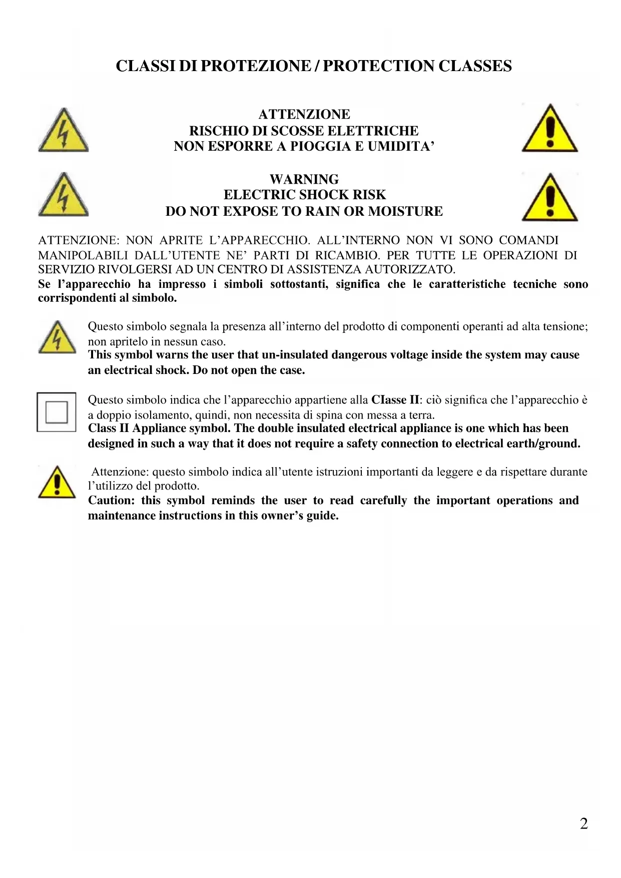 DO NOT EXPOSE TO RAIN OR MOISTURE ATTENZIONE: NON APRITE L’APPARECCHIO. ALL’INTERNO NON VI SONO COMANDI MANIPOLABILI DALL’UTENTE NE’ PARTI DI RICAMBIO. PER TUTTE LE OPERAZIONI DI SERVIZIO RIVOLGERSI AD UN CENTRO DI ASSISTENZA AUTORIZZATO. Se l’apparecchio ha impresso i simboli sottostanti, significa che le caratteristiche tecniche sono corrispondenti al simbolo. Questo simbolo segnala la presenza all’interno del prodotto di componenti operanti ad alta tensione; non apritelo in nessun caso. This symbol warns the user that un-insulated dangerous voltage inside the system may cause an electrical shock. Do not open the case. Questo simbolo indica che l’apparecchio appartiene alla CIasse II: ciò significa che l’apparecchio è a doppio isolamento, quindi, non necessita di spina con messa a terra. Class II Appliance symbol. The double insulated electrical appliance is one which has been designed in such a way that it does not require a safety connection to electrical earth/ground. Attenzione: questo simbolo indica all’utente istruzioni importanti da leggere e da rispettare durante l’utilizzo del prodotto. Caution: this symbol reminds the user to read carefully the important operations and maintenance instructions in this owner’s guide.3