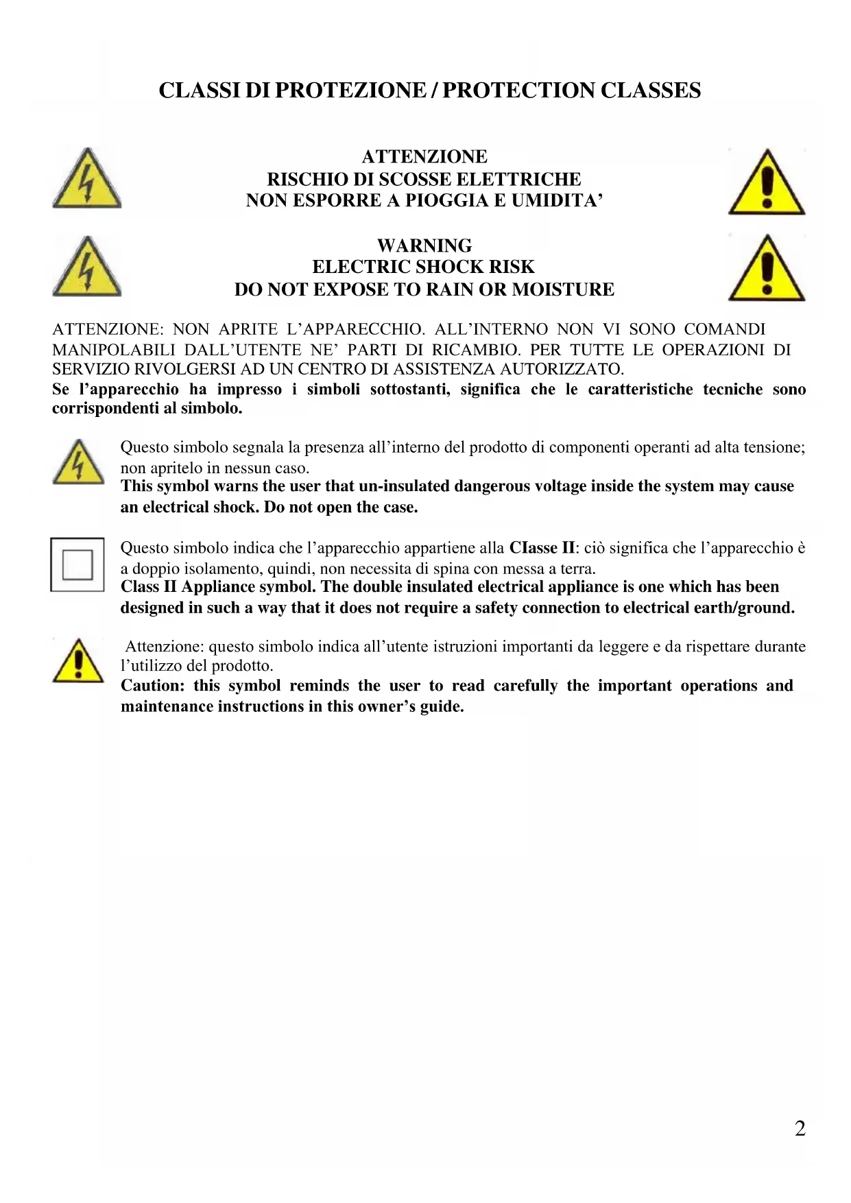 DO NOT EXPOSE TO RAIN OR MOISTURE ATTENZIONE: NON APRITE L’APPARECCHIO. ALL’INTERNO NON VI SONO COMANDI MANIPOLABILI DALL’UTENTE NE’ PARTI DI RICAMBIO. PER TUTTE LE OPERAZIONI DI SERVIZIO RIVOLGERSI AD UN CENTRO DI ASSISTENZA AUTORIZZATO. Se l’apparecchio ha impresso i simboli sottostanti, significa che le caratteristiche tecniche sono corrispondenti al simbolo. Questo simbolo segnala la presenza all’interno del prodotto di componenti operanti ad alta tensione; non apritelo in nessun caso. This symbol warns the user that un-insulated dangerous voltage inside the system may cause an electrical shock. Do not open the case. Questo simbolo indica che l’apparecchio appartiene alla CIasse II: ciò significa che l’apparecchio è a doppio isolamento, quindi, non necessita di spina con messa a terra. Class II Appliance symbol. The double insulated electrical appliance is one which has been designed in such a way that it does not require a safety connection to electrical earth/ground. Attenzione: questo simbolo indica all’utente istruzioni importanti da leggere e da rispettare durante l’utilizzo del prodotto. Caution: this symbol reminds the user to read carefully the important operations and maintenance instructions in this owner’s guide.3