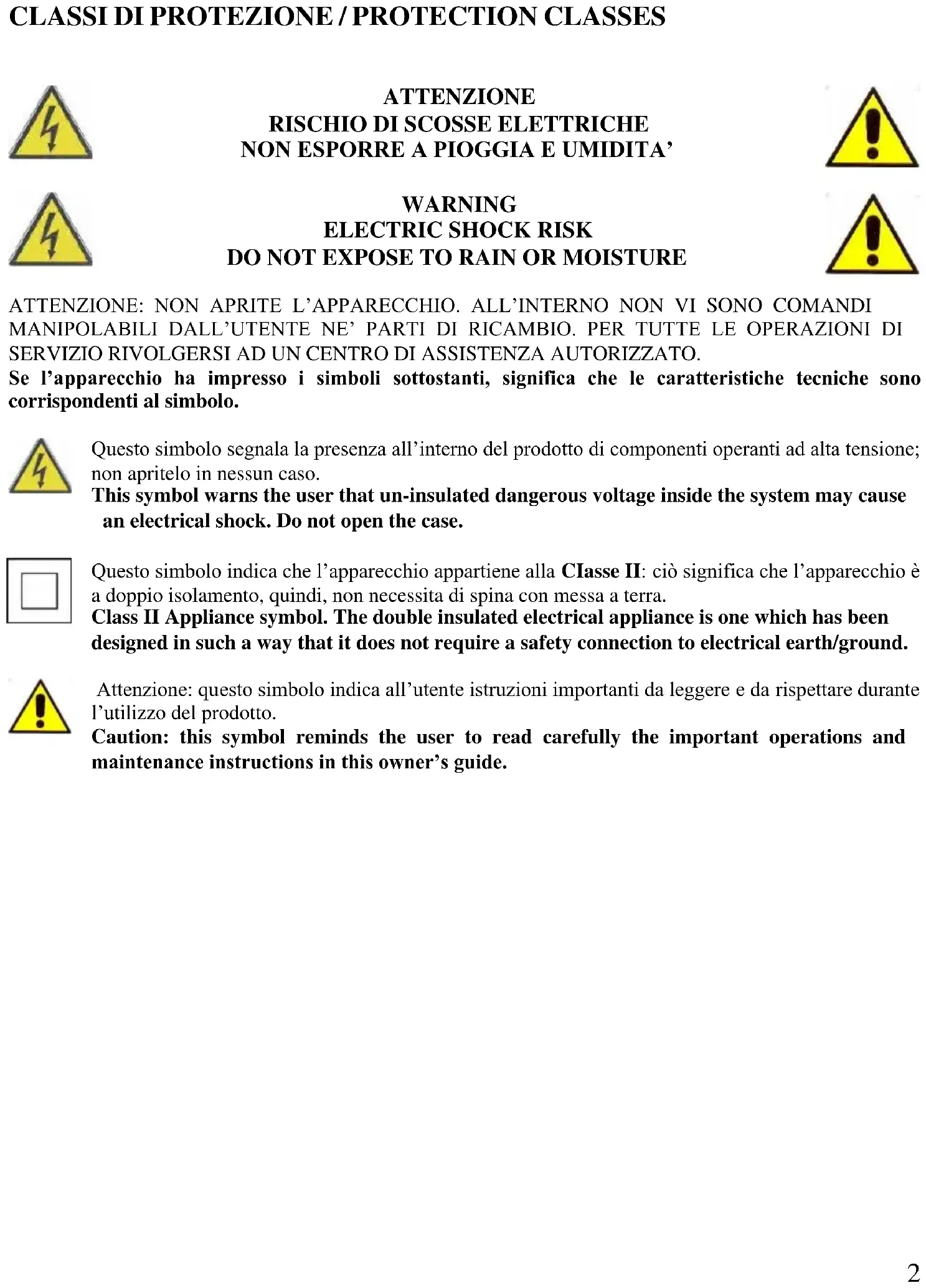 DO NOT EXPOSE TO RAIN OR MOISTURE ATTENZIONE: NON APRITE L’APPARECCHIO. ALL’INTERNO NON VI SONO COMANDI MANIPOLABILI DALL’UTENTE NE’ PARTI DI RICAMBIO. PER TUTTE LE OPERAZIONI DI SERVIZIO RIVOLGERSI AD UN CENTRO DI ASSISTENZA AUTORIZZATO. Se l’apparecchio ha impresso i simboli sottostanti, significa che le caratteristiche tecniche sono corrispondenti al simbolo. Questo simbolo segnala la presenza all’interno del prodotto di componenti operanti ad alta tensione; non apritelo in nessun caso. This symbol warns the user that un-insulated dangerous voltage inside the system may cause an electrical shock. Do not open the case. Questo simbolo indica che l’apparecchio appartiene alla CIasse II: ciò significa che l’apparecchio è a doppio isolamento, quindi, non necessita di spina con messa a terra. Class II Appliance symbol. The double insulated electrical appliance is one which has been designed in such a way that it does not require a safety connection to electrical earth/ground. Attenzione: questo simbolo indica all’utente istruzioni importanti da leggere e da rispettare durante l’utilizzo del prodotto. Caution: this symbol reminds the user to read carefully the important operations and maintenance instructions in this owner’s guide.3