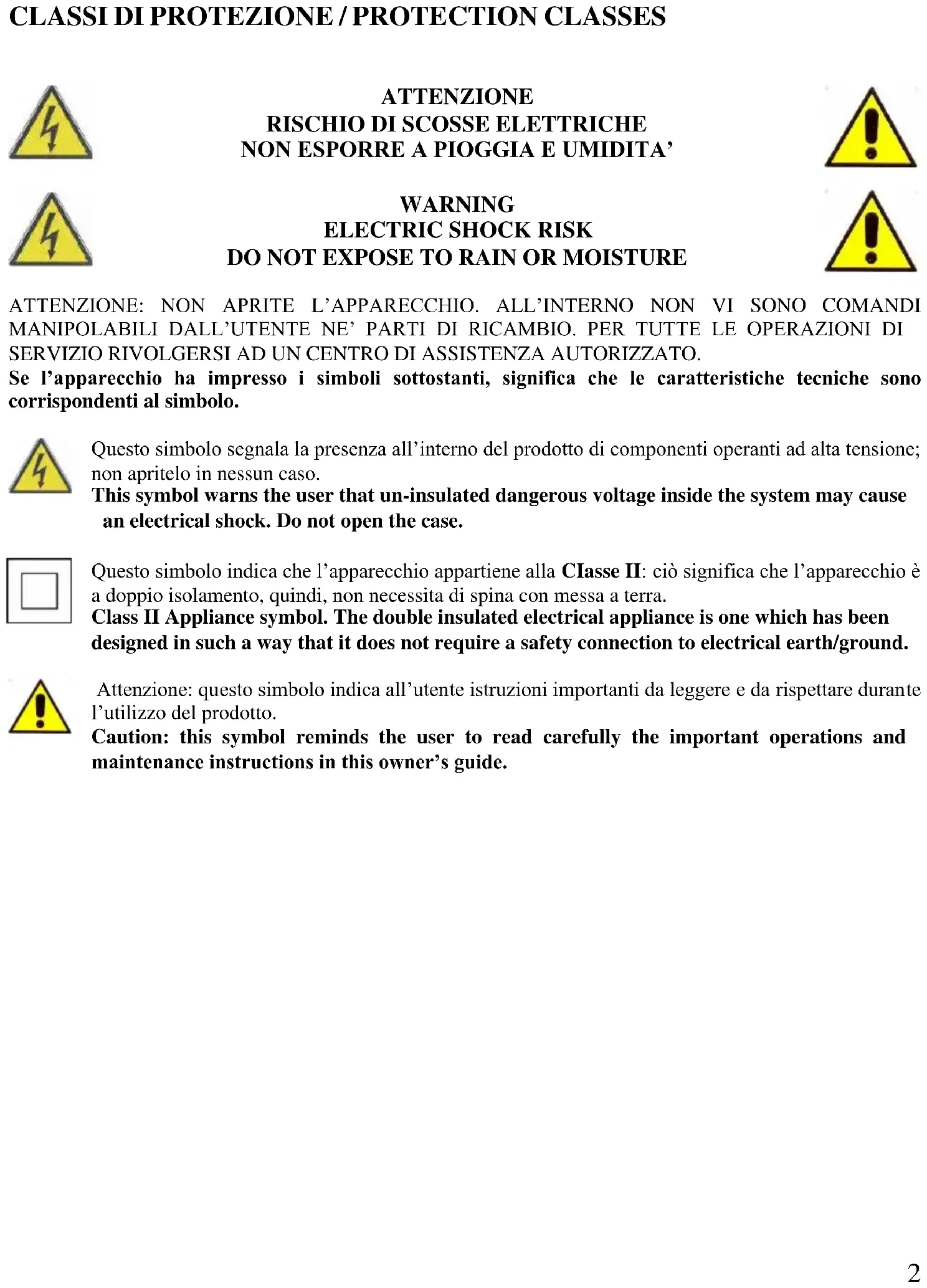 DO NOT EXPOSE TO RAIN OR MOISTURE ATTENZIONE: NON APRITE L’APPARECCHIO. ALL’INTERNO NON VI SONO COMANDI MANIPOLABILI DALL’UTENTE NE’ PARTI DI RICAMBIO. PER TUTTE LE OPERAZIONI DI SERVIZIO RIVOLGERSI AD UN CENTRO DI ASSISTENZA AUTORIZZATO. Se l’apparecchio ha impresso i simboli sottostanti, significa che le caratteristiche tecniche sono corrispondenti al simbolo. Questo simbolo segnala la presenza all’interno del prodotto di componenti operanti ad alta tensione; non apritelo in nessun caso. This symbol warns the user that un-insulated dangerous voltage inside the system may cause an electrical shock. Do not open the case. Questo simbolo indica che l’apparecchio appartiene alla CIasse II: ciò significa che l’apparecchio è a doppio isolamento, quindi, non necessita di spina con messa a terra. Class II Appliance symbol. The double insulated electrical appliance is one which has been designed in such a way that it does not require a safety connection to electrical earth/ground. Attenzione: questo simbolo indica all’utente istruzioni importanti da leggere e da rispettare durante l’utilizzo del prodotto. Caution: this symbol reminds the user to read carefully the important operations and maintenance instructions in this owner’s guide.3