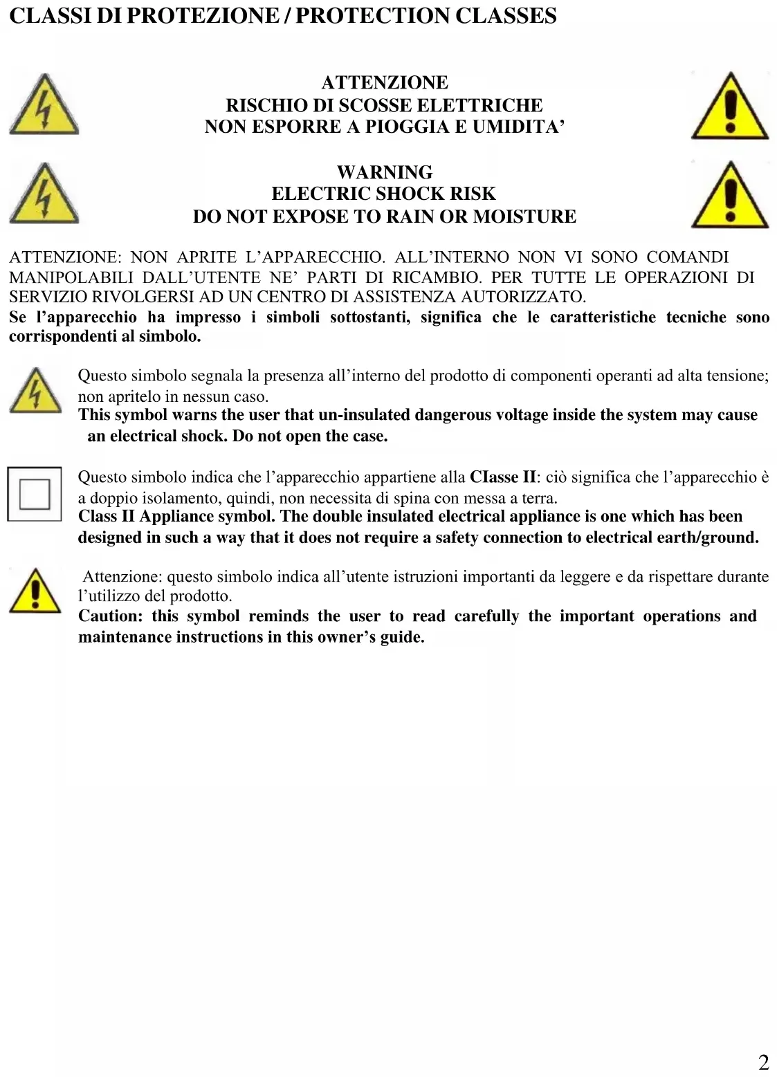 DO NOT EXPOSE TO RAIN OR MOISTURE ATTENZIONE: NON APRITE L’APPARECCHIO. ALL’INTERNO NON VI SONO COMANDI MANIPOLABILI DALL’UTENTE NE’ PARTI DI RICAMBIO. PER TUTTE LE OPERAZIONI DI SERVIZIO RIVOLGERSI AD UN CENTRO DI ASSISTENZA AUTORIZZATO. Se l’apparecchio ha impresso i simboli sottostanti, significa che le caratteristiche tecniche sono corrispondenti al simbolo. Questo simbolo segnala la presenza all’interno del prodotto di componenti operanti ad alta tensione; non apritelo in nessun caso. This symbol warns the user that un-insulated dangerous voltage inside the system may cause an electrical shock. Do not open the case. Questo simbolo indica che l’apparecchio appartiene alla CIasse II: ciò significa che l’apparecchio è a doppio isolamento, quindi, non necessita di spina con messa a terra. Class II Appliance symbol. The double insulated electrical appliance is one which has been designed in such a way that it does not require a safety connection to electrical earth/ground. Attenzione: questo simbolo indica all’utente istruzioni importanti da leggere e da rispettare durante l’utilizzo del prodotto. Caution: this symbol reminds the user to read carefully the important operations and maintenance instructions in this owner’s guide.3