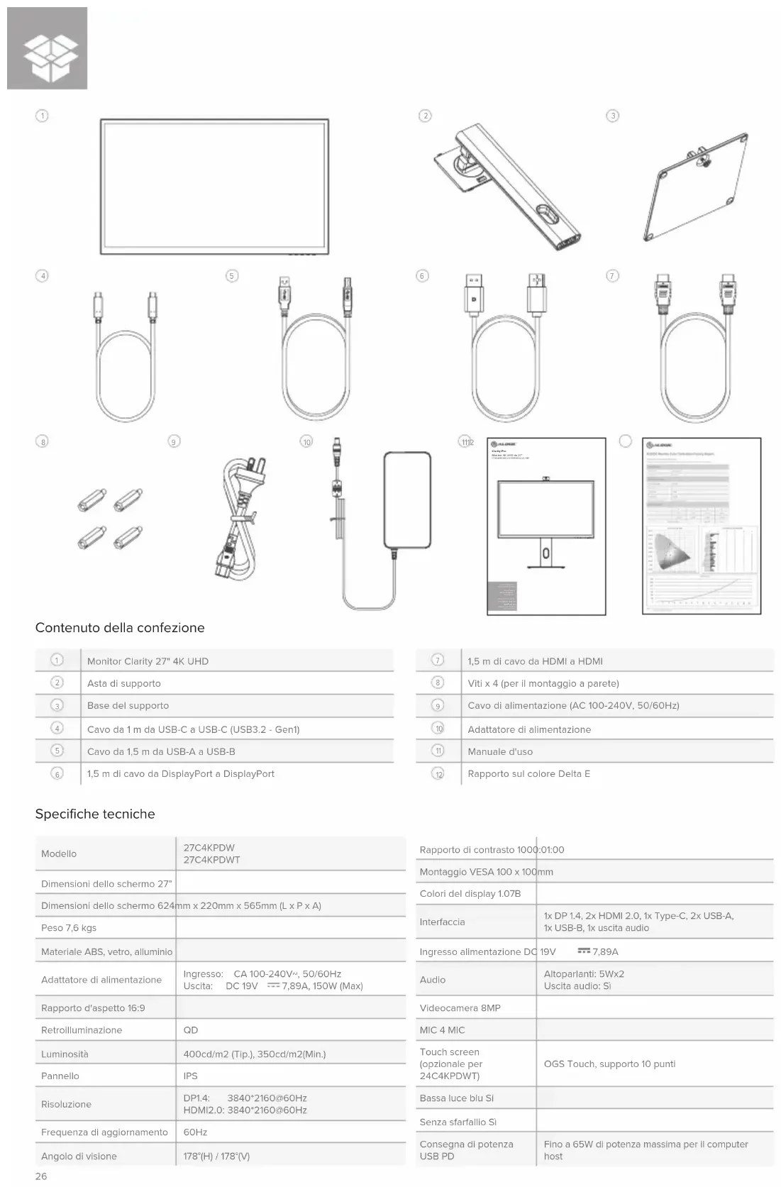 Contenuto della confezione Monitor Clarity 27" 4K UHD Asta di supporto Base del supporto Cavo da 1 m da USB-C a USB-C (USB3.2 - Gen1) Cavo da 1,5 m da USB-A a USB-B 1,5 m di cavo da DisplayPort a DisplayPort 1,5 m di cavo da HDMI a HDMI Viti x 4 (per il montaggio a parete) Cavo di alimentazione (AC 100-240V, 50/60Hz) Adattatore di alimentazione Manuale d'uso Rapporto sul colore Delta E