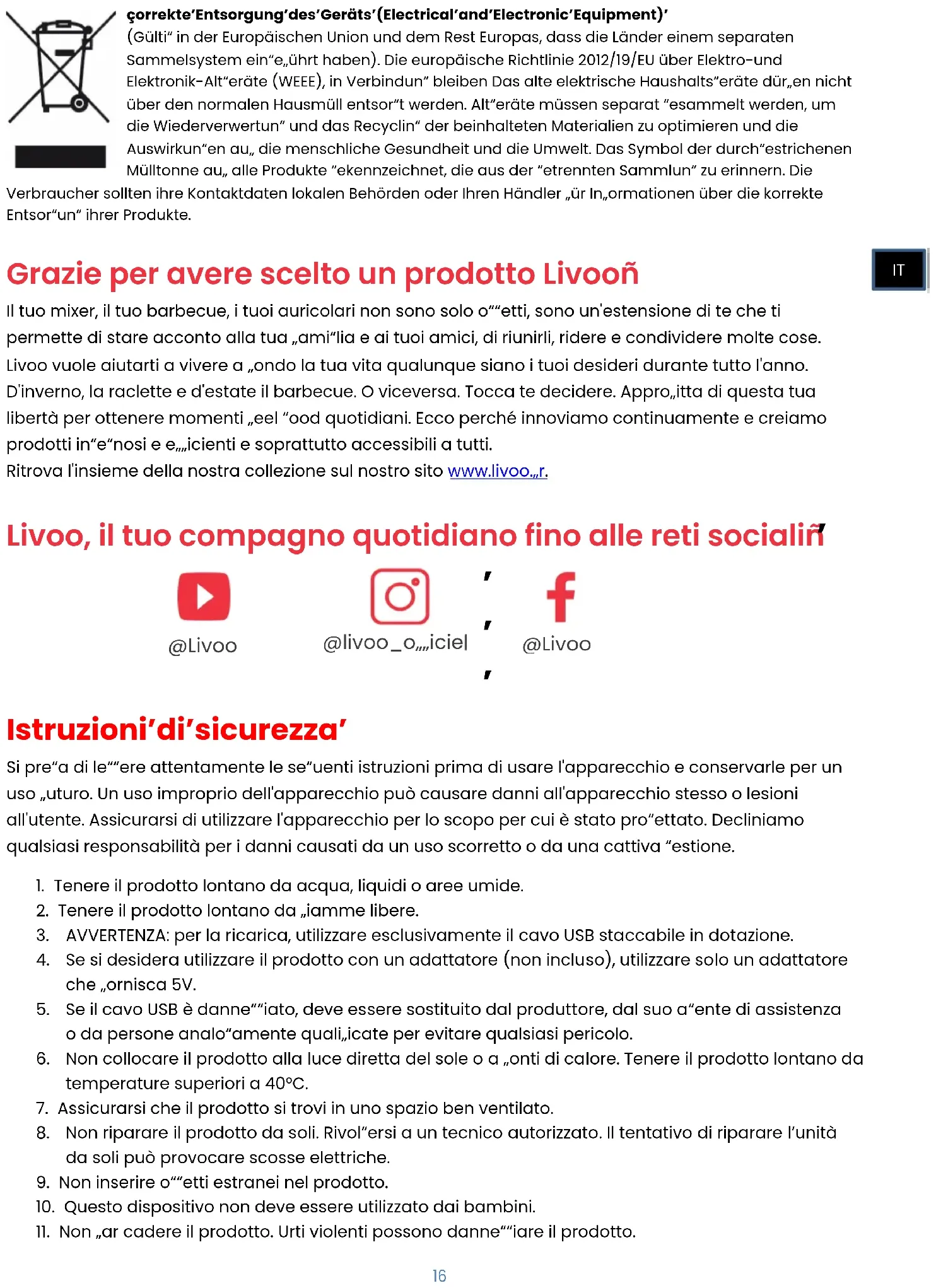 Istruzioni di sicurezza Si prega di leggere attentamente le seguenti istruzioni prima di usare l'apparecchio e conservarle per un uso futuro. Un uso improprio dell'apparecchio può causare danni all'apparecchio stesso o lesioni all'utente. Assicurarsi di utilizzare l'apparecchio per lo scopo per cui è stato progettato. Decliniamo qualsiasi responsabilità per i danni causati da un uso scorretto o da una cattiva gestione.