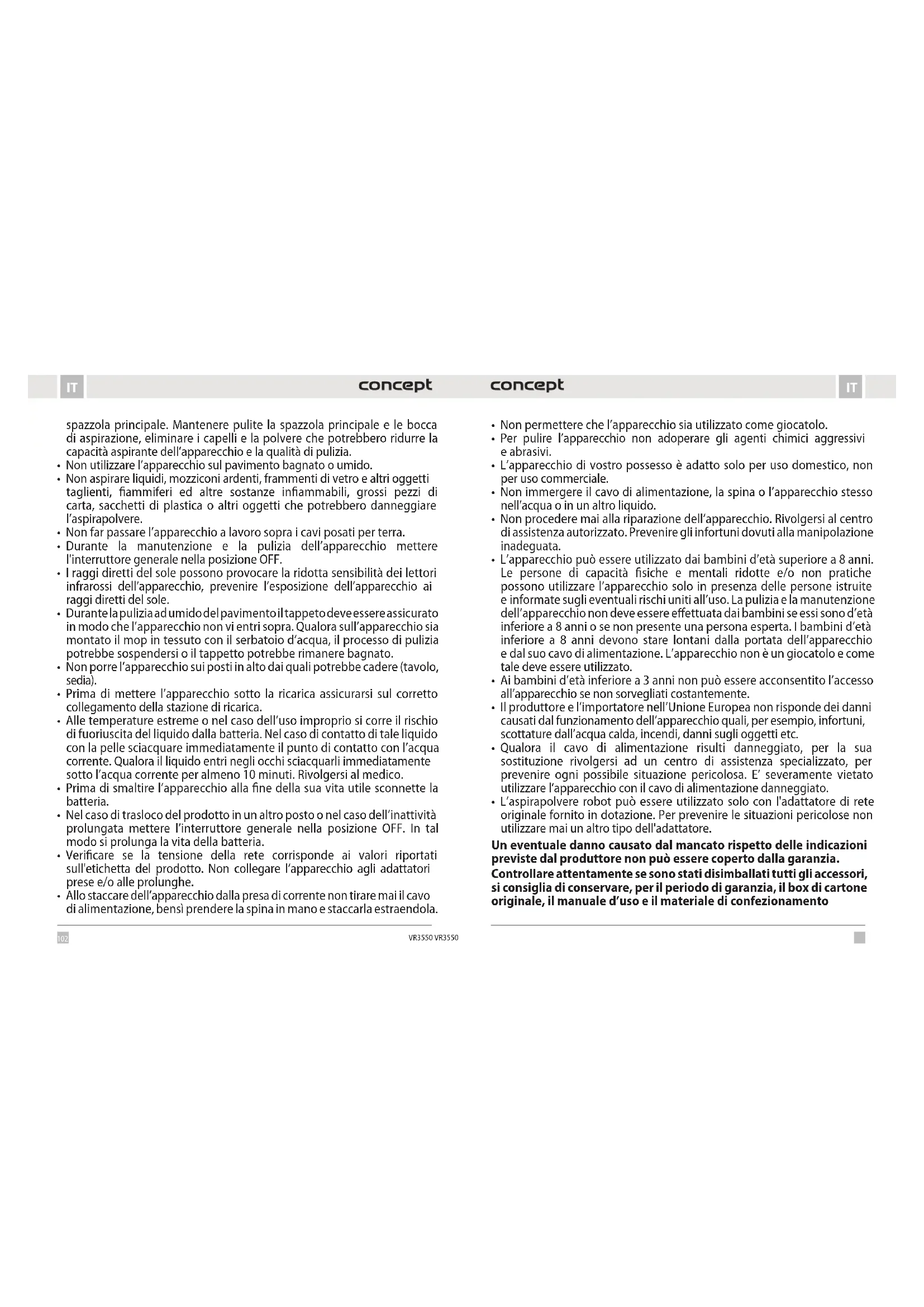 - L’aspirapolvere robot può essere utilizzato solo con l'adattatore di rete originale fornito in dotazione. Per prevenire le situazioni pericolose non utilizzare mai un altro tipo dell'adattatore. Un eventuale danno causato dal mancato rispetto delle indicazioni previste dal produttore non può essere coperto dalla garanzia. Controllare attentamente se sono stati disimballati tutti gli accessori, si consiglia di conservare, per il periodo di garanzia, il box di cartone originale, il manuale d’uso e il materiale di confezionamento104 105 ITIT VR3550 VR3550