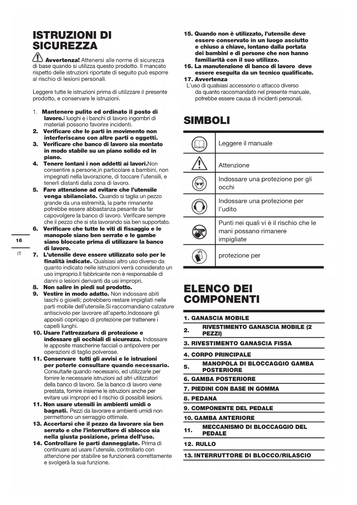 per poterle consultare quando necessario. Consultarle quando necessario, ed utilizzarle per fornire le necessarie istruzioni ad altri utilizzatori della banco di lavoro. Se la banco di lavoro viene prestata, fornire insieme le istruzioni anche per evitare usi impropri ed il rischio di possibili lesioni.