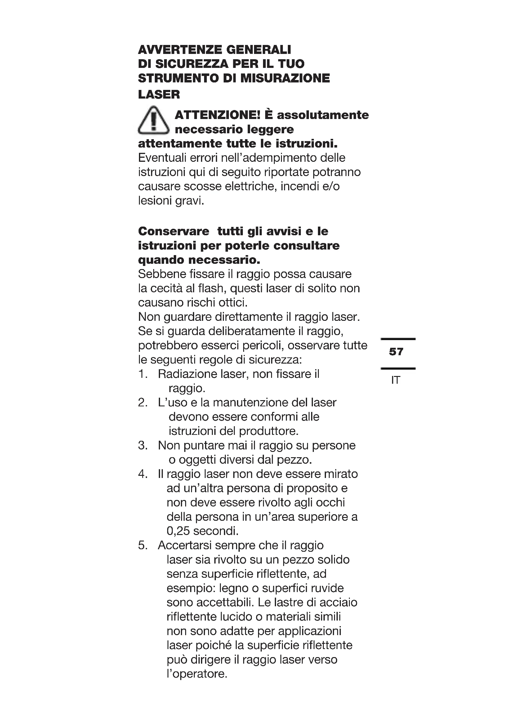 LASER ATTENZIONE! È assolutamente necessario leggere attentamente tutte le istruzioni. Eventuali errori nell’adempimento delle istruzioni qui di seguito riportate potranno causare scosse elettriche, incendi e/o lesioni gravi. Conservare tutti gli avvisi e le istruzioni per poterle consultare quando necessario. Sebbene ssare il raggio possa causare la cecità al ash, questi laser di solito non causano rischi ottici. Non guardare direttamente il raggio laser. Se si guarda deliberatamente il raggio, potrebbero esserci pericoli, osservare tutte le seguenti regole di sicurezza: